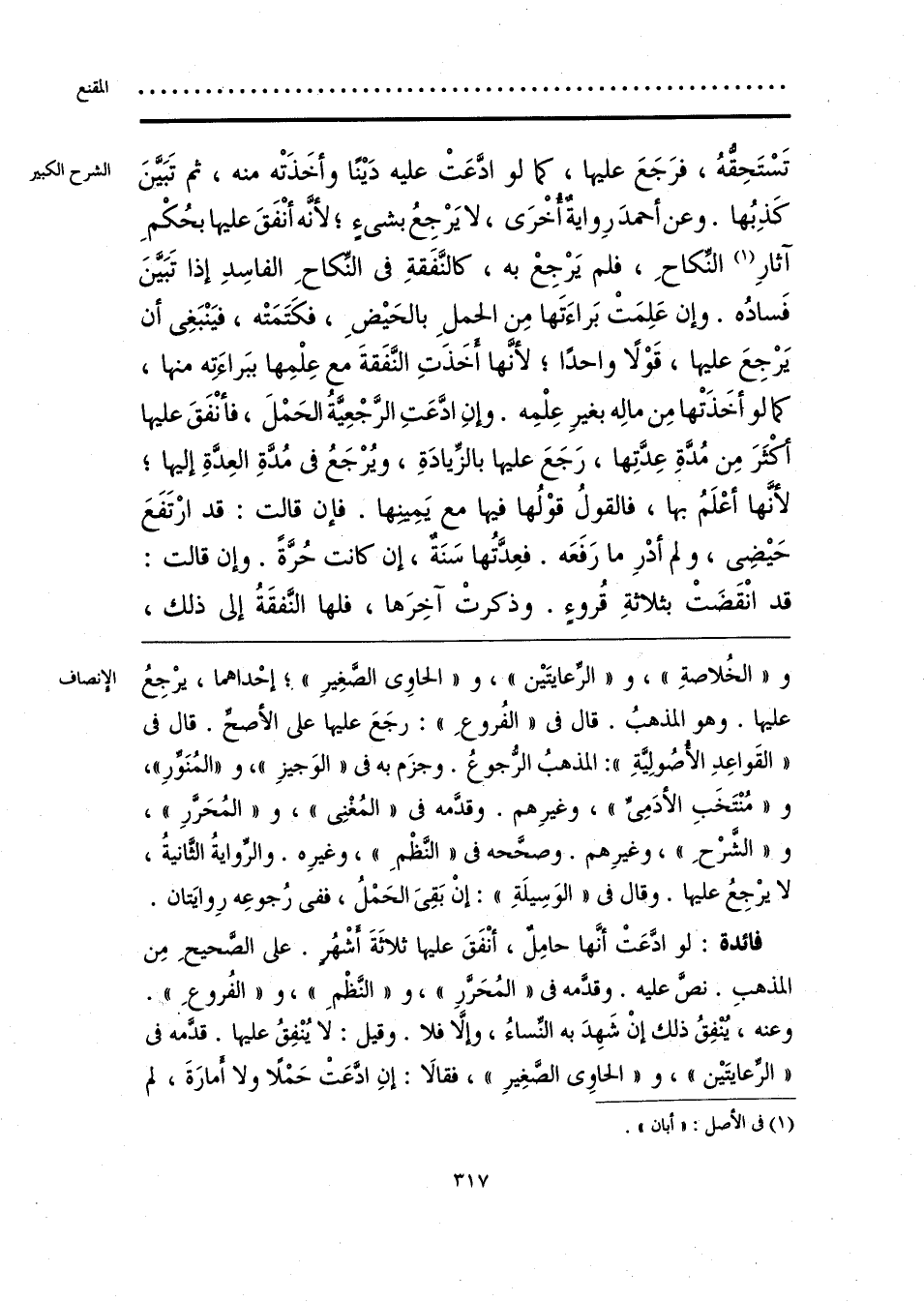 و «الخُلاصةِ»، و «الرِّعايتَيْن»، و «الحاوِى الصَّغِيرِ»؛ إحْداهما، يرْجِعُ عليها. وهو المذهبُ. قال فى «الفُروعِ»: رجَعَ عليها على الأصحِّ. قال فى «القَواعِدِ الأُصُولِيَّةِ»: المذهبُ الرُّجوعُ. وجزَم به فى «الوَجيزِ»، و «المُنَوِّرِ»، و «مُنْتَخَبِ الأدَمِىِّ»، وغيرِهم. وقدَّمه فى «المُغْنِى»، و «المُحَرَّرِ»، و «الشَّرْحِ»، وغيرِهم. وصحَّحه فى «النَّظْمِ»، وغيرِه. والرِّوايةُ الثَّانيةُ، لا يرْجِعُ عليها. وقال فى «الوَسِيلَةِ»: إنْ بَقِىَ الحَمْلُ، ففى رُجوعِه رِوايَتان.