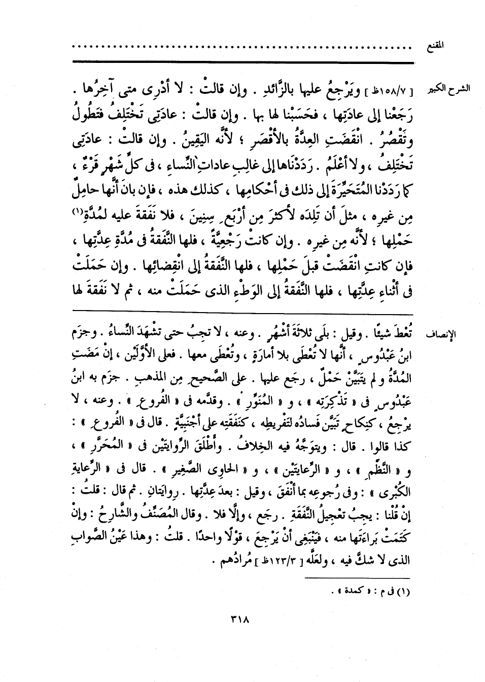 تُعْطَ شيئًا. وقيل: بلَى ثلاثَةَ أشْهُرٍ. وعنه، لا تجِبُ حتى تشْهَدَ النِّساءُ. وجزَم ابنُ عَبْدُوسٍ، أنَّها لا تُعْطَى بلا أمارَةٍ، وتُعْطَى معها. فعلى الأوَّلَيْن، إنْ مَضَتِ المُدَّةُ ولم يتَبَيَّنْ حَمْلٌ، رجَع عليها. على الصَّحيحِ مِن المذهبِ. جزَم به ابنُ عَبْدُوسٍ فى «تَذْكِرَتِه»، و «المُنَوِّرِ». وقدَّمه فى «الفُروعِ». وعنه، لا يرْجِعُ، كنِكاحٍ تَبَيَّن فَسادُه لتَفْريطِه، كنَفَقَتِه على أجْنَبِيَّةٍ. قال فى «الفُروعِ»: كذا قالوا. قال: ويتوَجَّهُ فيه الخِلافُ. وأَطْلَقَ الرِّوايتَيْن فى «المُحَرَّرِ»، و «النَّظْمِ»، و «الرِّعايتَيْن»، و «الحاوِى الصَّغِيرِ». قال فى «الرِّعايَةِ الكُبْرى»: وفى رُجوعِه بما أنْفَقَ، وقيل: بعدَ عِدَّتِها. رِوايَتانِ. ثمَّ قال: قلتُ: إنْ قُلْنا: يجِبُ تعْجِيلُ النَّفَقَةِ. رجَع، وإلَّا فلا. وقال المُصَنِّفُ والشَّارِحُ: وإنْ كَتَمَتْ بَراءَتَها منه، فيَنْبَغِى أَنْ يَرْجِعَ، قوْلًا واحدًا. قلتُ: وهذا عَيْنُ الصَّوابِ الذى لا شكَّ فيه، ولعَلَّه مُرادُهم.