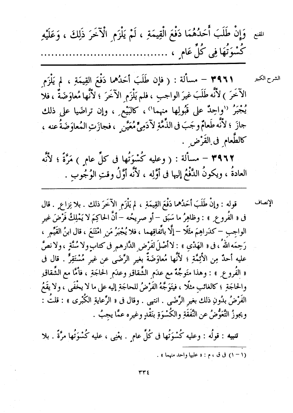 قوله: وإنْ طَلَبَ أحَدُهما دَفْعَ القِيمَةِ، لم يَلْزَمِ الآخَرَ ذلك. بلا نِزاعٍ. قال فى «الفُروعِ»: وظاهِرُ ما سَبَق -أو صرِيحُه- أنَّ الحاكِمَ لا يَمْلِكُ فَرْضَ غيرِ الواجِبِ -كدَراهِمَ مثَلًا- إلَّا باتِّفاقِهما، فلا يُجْبَرُ مَنِ امْتَنَعَ، قال ابنُ القَيِّمِ، رَحِمَه اللَّهُ، فى «الهَدْى»: لا أصْلَ لفَرْضِ الدَّارهمِ فى كتابٍ ولا سُنَّةٍ، ولا نصَّ عليه أحدٌ مِن الأئِمَّةِ؛ لأنَّها مُعاوَضَةٌ بغيرِ الرِّضَى عن غيرِ مُسْتَقِرٍّ. قال فى «الفُروعِ»: وهذا متَوجِّهٌ مع عدَمِ الشِّقاقِ وعدَمِ الحاجَةِ، فأمَّا مع الشِّقاقِ والحاجَةِ؛ كالغائبِ مثلًا، فيتَوَجَّهُ الفَرْضُ للحاجَةِ إليه على ما لا يخْفَى، ولا يقَعُ الفَرْضُ بدُونِ ذلك بغيرِ الرِّضَى. انتهى. وقال فى «الرِّعايَةِ الكُبْرى»: قلتُ: ويجوزُ التَّعَوُّضُ عن النَّفَقَةِ والكُسْوَةِ بنَقْدٍ وغيرِه عمَّا يجِبُ.
