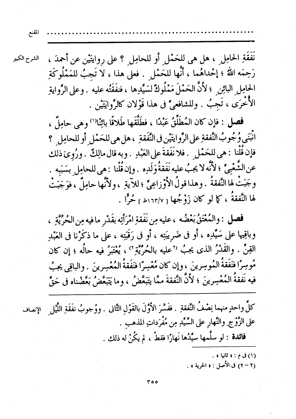 كلِّ واحدٍ منهما نِصْفُ النَّفقةِ. ففَسَّرَ الأوَّلَ بالقَوْلِ الثَّانى. ووُجوبُ نفَقَةِ اللَّيْلِ على الزَّوْجِ والنَّهارِ على السَّيِّدِ مِن مُفْرَداتِ المذهبِ.