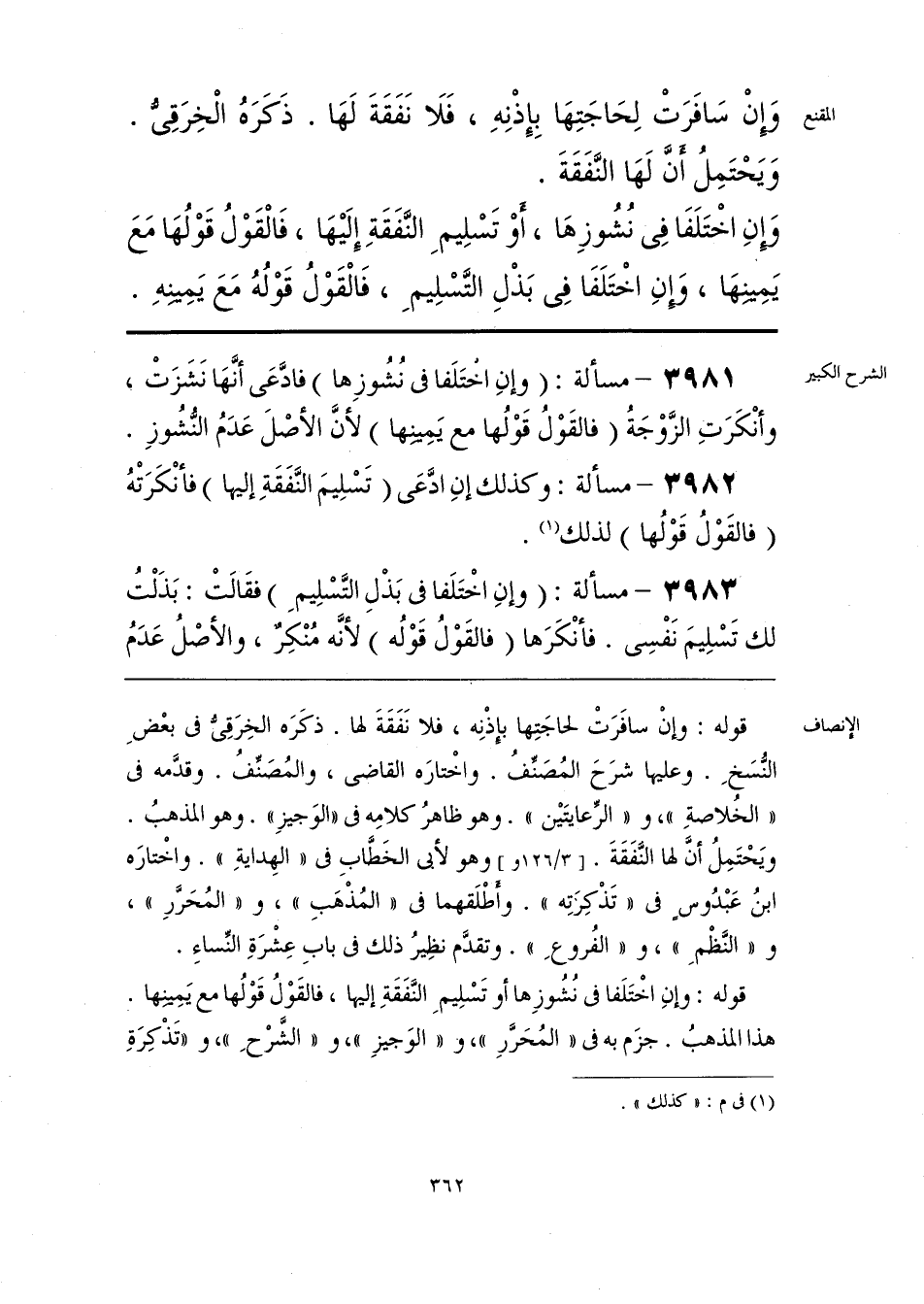 قوله: وإنْ سافَرَتْ لحاجَتِها بإِذْنِه، فلا نَفَقَةَ لها. ذكَرَه الخِرَقِىُّ فى بعْضِ النُّسَخِ. وعليها شرَحَ المُصَنِّفُ. واخْتارَه القاضى، والمُصَنِّفُ. وقدَّمه فى «الخُلاصةِ»، و «الرِّعايتَيْن». وهو ظاهرُ كلامِه فى «الوَجيزِ». وهو المذهبُ. ويَحْتَمِلُ أنَّ لها النَّفَقَةَ. وهو لأبى الخَطَّابِ فى «الهِدايَةِ». واخْتارَه ابنُ عَبْدُوسٍ فى «تَذْكِرَتِه». وأطْلَقهما فى «المُذْهَبِ»، و «المُحَرَّرِ»، و «النَّظْمِ»، و «الفُروعِ». وتقدَّم نظِيرُ ذلك فى بابِ عِشْرَةِ النِّساءِ.