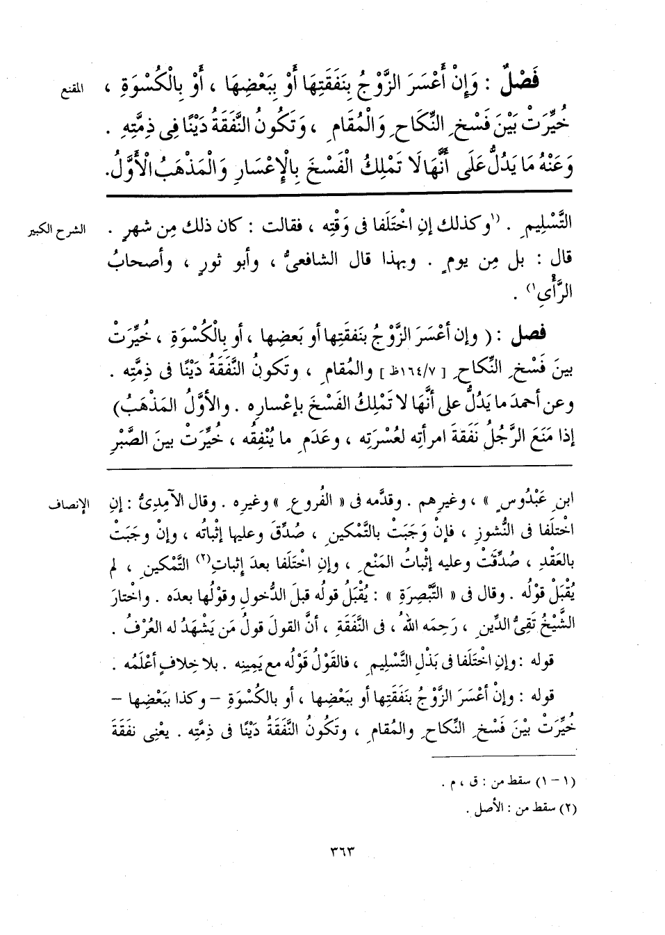 قوله: وإنْ أعْسَرَ الزَّوْجُ بنَفَقَتِها أو ببَعْضِها، أو بالكُسْوَةِ -وكذا ببَعْضِها- خُيِّرَتْ بيْنَ فَسْخِ النِّكاحِ والمُقامِ، وتَكُونُ النَّفَقَةُ دَيْنًا فى ذِمَّتِه. يعْنِى نفَقَةَ