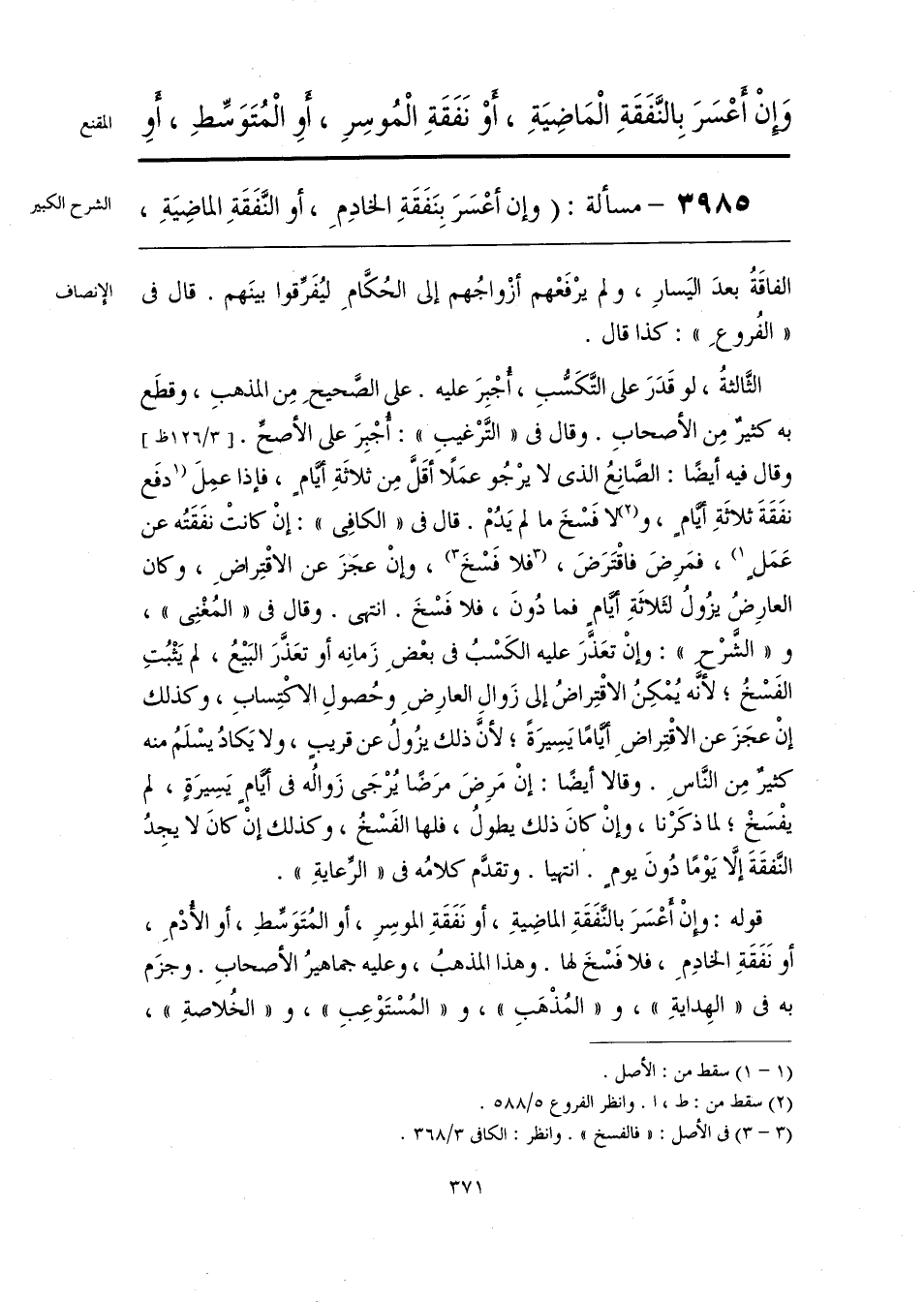 قوله: وإِنْ أَعْسَرَ بالنَّفَقَةِ الماضِيةِ، أو نَفَقَةِ الموسِرِ، أو المُتَوَسِّطِ، أو الأُدْمِ، أو نَفَقَةِ الخادِمِ، فلا فَسْخَ لها. وهذا المذهبُ، وعليه جماهيرُ الأصحابِ. وجزَم به فى «الهِدايَةِ»، و «المُذْهَبِ»، و «المُسْتَوْعِبِ»، و «الخُلاصةِ»،