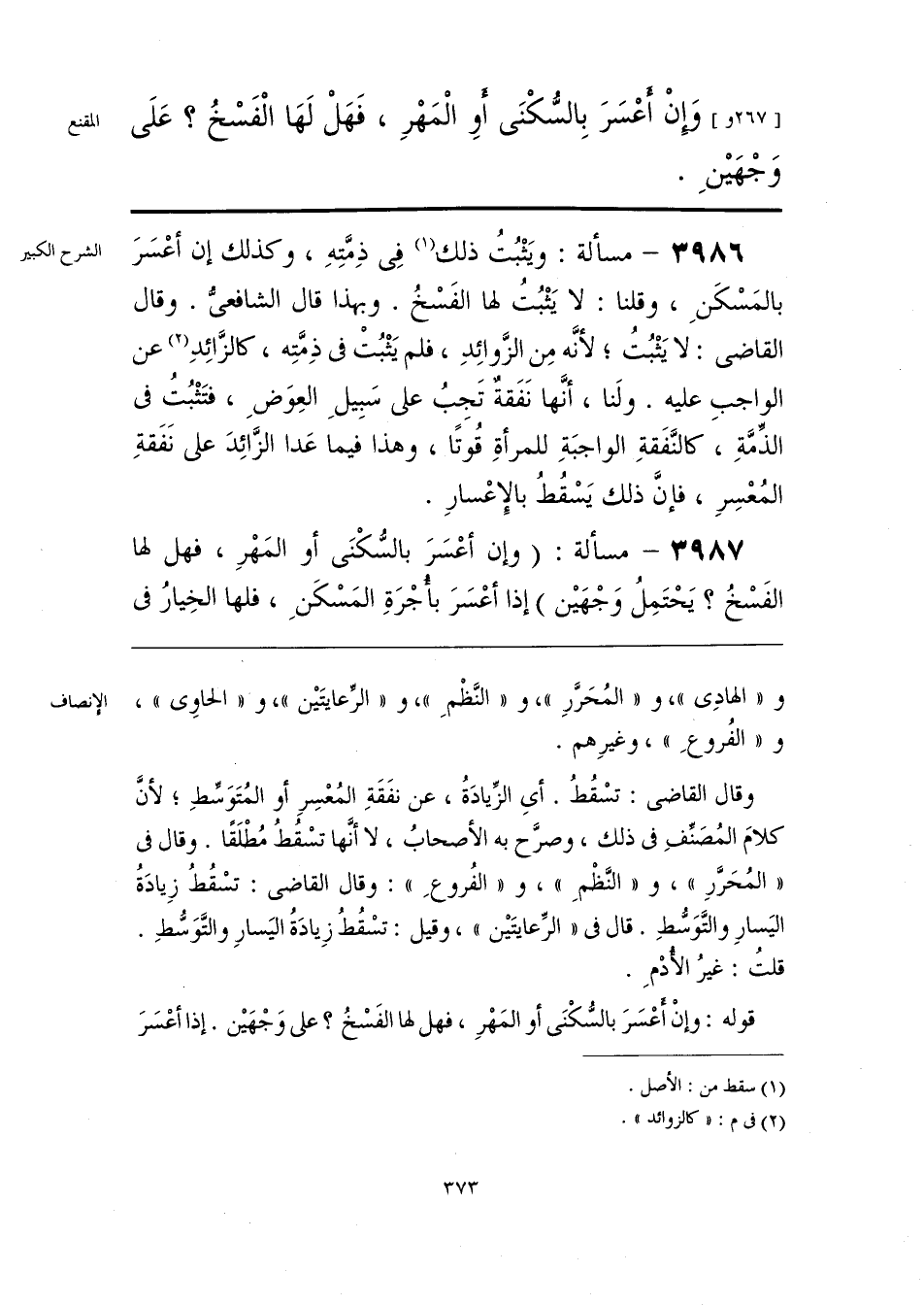 قوله: وإنْ أَعْسَرَ بالسُّكْنَى أو المَهْرِ، فهل لها الفَسْخُ؟ على وَجْهَيْن. إذا أعْسَرَ