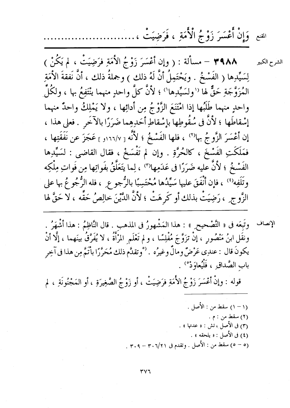 قوله: وإنْ أعْسَرَ زَوْجُ الأَمَةِ فرَضِيَتْ، أو زَوْجُ الصَّغِيرَةِ، أو المَجْنُونَةِ، لم