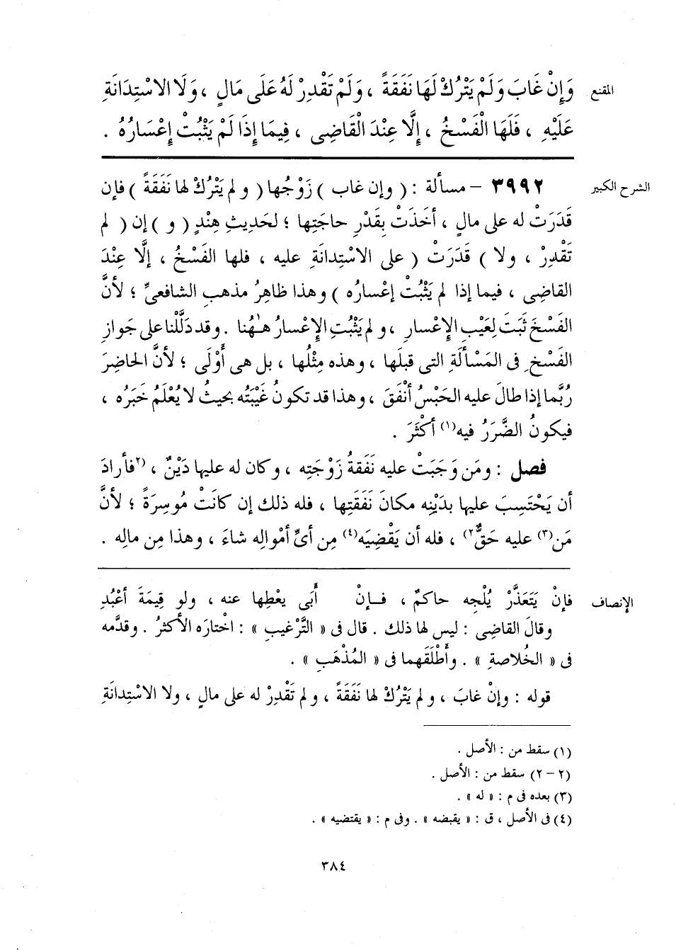 وَإِنْ غَابَ وَلَمْ يَتْرُكْ لَهَا نَفَقَةً، وَلَمْ تَقْدِرْ لَهُ عَلَى مَالٍ، وَلَا الاسْتِدَانَةِ عَلَيْهِ، فَلَهَا الْفَسْخُ، إِلَّا عِنْدَ الْقَاضِى، فِيمَا إِذَا لَمْ يَثْبُتْ إِعْسَارُهُ.
