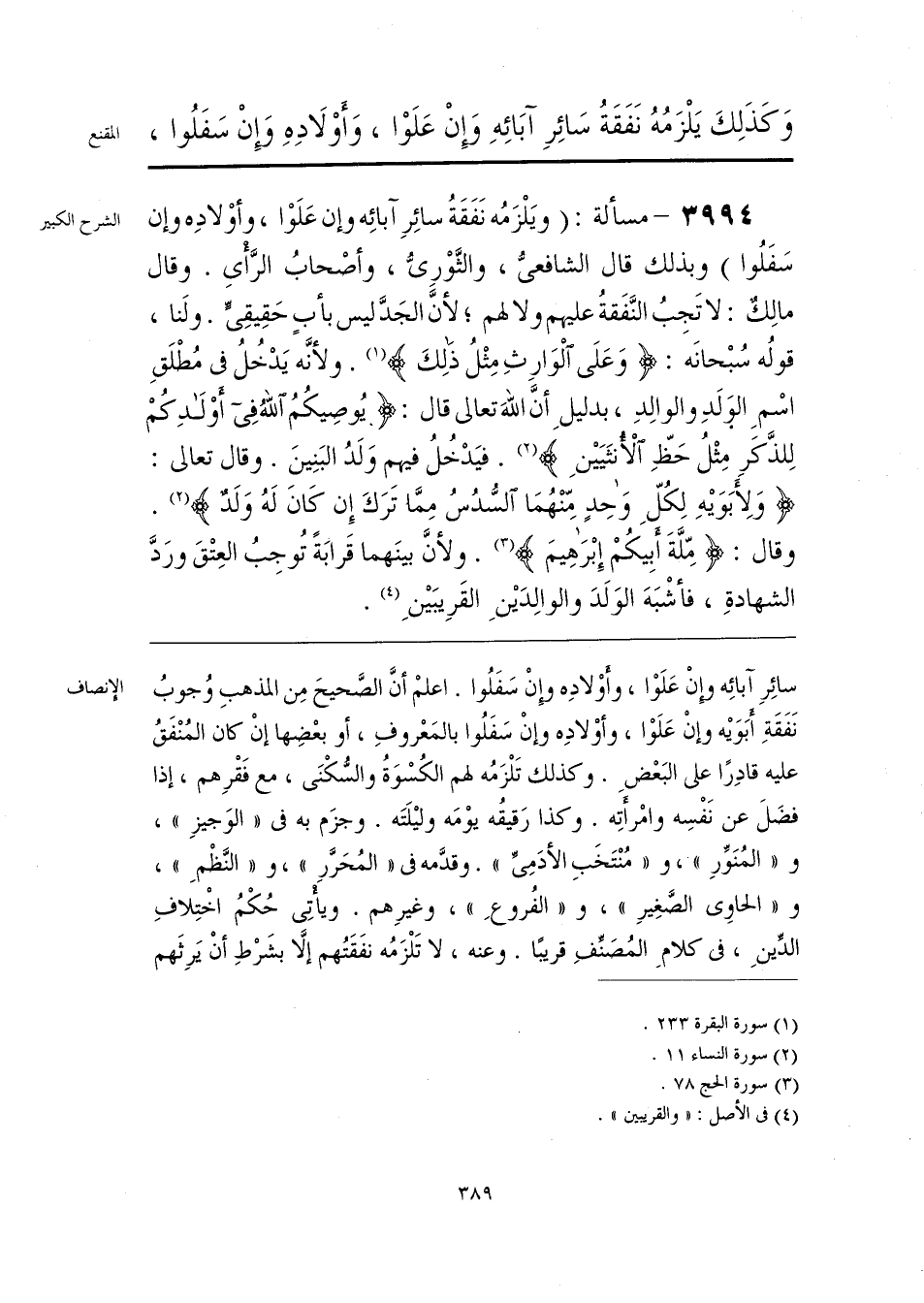 سائِرِ آبائِه وإِنْ عَلَوْا، وأَوْلادِه وإِنْ سَفَلُوا. اعلمْ أنَّ الصَّحيحَ مِن المذهبِ وُجوبُ نَفَقَةِ أَبَوَيْه وإنْ عَلَوْا، وأوْلادِه وإنْ سَفَلُوا بالمَعْروفِ، أو بعْضِها إنْ كان المُنْفَقُ عليه قادِرًا على البَعْضِ. وكذلك تَلْزَمُه لهم الكُسْوَةُ والسُّكْنَى، مع فَقْرِهم، إذا فضَلَ عن نَفْسِه وامْرأَتِه. وكذا رَقيقُه يوْمَه وليْلَتَه. وجزَم به فى «الوَجيزِ»، و «المُنَوِّرِ»، و «مُنْتَخَبِ الأدَمِىِّ». وقدَّمه فى «المُحَرَّرِ»، و «النَّظْمِ»، و «الحاوِى الصَّغِيرِ»، و «الفُروعِ»، وغيرِهم. ويأْتِى حُكْمُ اخْتِلافِ الدِّينِ، فى كلامِ المُصَنِّفِ قريبًا. وعنه، لا تَلْزَمُه نفَقَتُهم إلَّا بشَرْطِ أَنْ يَرِثَهم