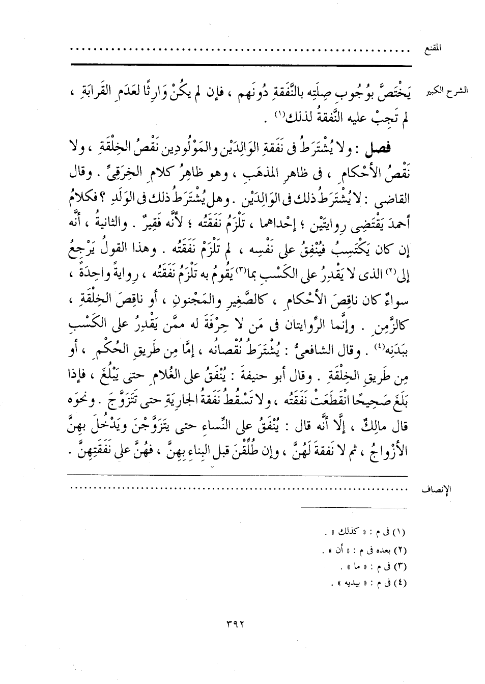 فصل: ولا يُشْتَرَطُ في نَفَقةِ الوَالِدَيْن والمَوْلُودِين نَقْصُ الخِلْقَةِ، ولا نَقْصُ الأحْكامِ، في ظاهرِ الذَّهَبِ، وهو ظاهِرُ كلامِ الخِرَقِىِّ. وقال القاضى: لا يُشْتَرَطُ ذلك في الوَالِدَيْن. وهل يُشتَرَطُ ذلك في الوَلَدِ؟ فكلامُ أحمدَ يَقْتَضِى رِوايتَيْن؛ إحْداهما، تَلْزَمُ نَفَقَتُه؛ لأنَّه فَقِيرٌ. والثانيةُ، أنَّه إن كان يَكْتَسِبُ فيُنْفِقُ على نَفْسِه، لم تَلْزَمْ نَفَقَتُه. وهذا القولُ يَرْجِعُ إلى (¬2) الذى لا يَقْدِرُ على الكَسْبِ بما (¬3) يَقُومُ به تَلْزَمُ نَفَقَتُه، رِوايةً واحِدَةً، سواءٌ كان ناقِصَ الأَحْكامِ، كالصَّغِيرِ والمَجْنونِ، أو ناقِصَ الخِلْقَةِ، كالزَّمِنِ. وإنَّما الرِّوايتانَ في مَن لا حِرْفَةَ له ممَّن يَقدِرُ على الكَسْبِ ببَدَنِه (¬4). وقال الشافعىُّ: يُشْتَرَطُ نُقْصانُه، إمَّا مِن طَريقِ الحُكْمِ، أو مِن طَريقِ الخِلْقَةِ. وِقال أبو حنيفةَ: يُنْفَقُ على الغُلامِ حتى يَبْلُغَ، فإذا بَلَغَ صَحِيحًا انْقَطَعَتْ نفَقَتُه، ولا تَسْقُطُ نَفَقةُ الجارِيَةِ حتى تَتَزَوَّجَ. ونحوَه قال مالِكٌ، إلَّا أنَّه قال: يُنْفَقُ على النِّساءِ حتى يتَزَوَّجْنَ ويَدْخُلَ بهِنَّ الأزْواجُ، ثم لا نَفقةَ لَهُنَّ، وإن طُلِّقْنَ قبل البِناءِ بِهِنَّ، فهُنَّ على نَفَقَتِهِنَّ.