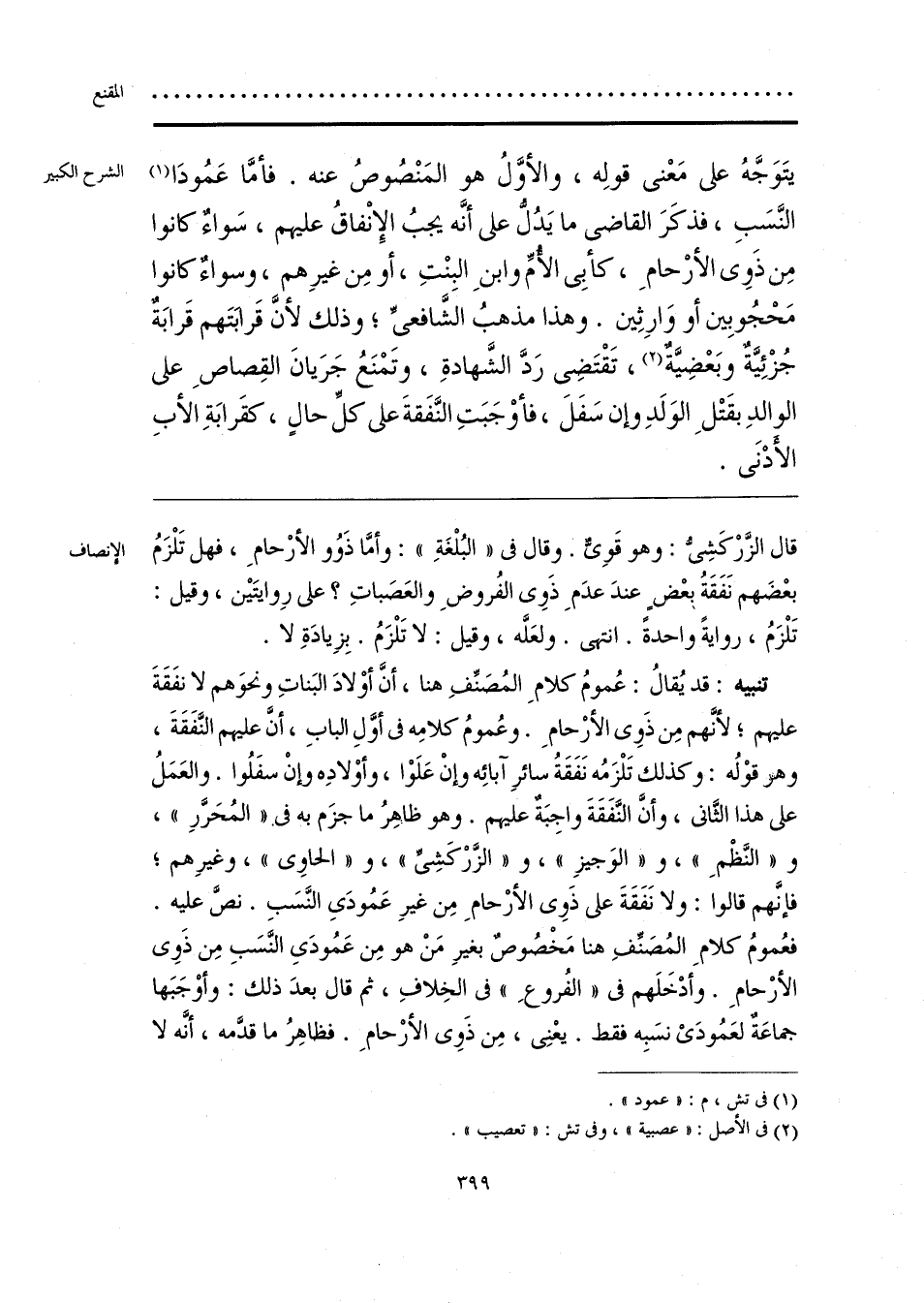 تنبيه: قد يُقالُ: عُمومُ كلامِ المُصَنِّفِ هنا، أنَّ أوْلادَ البَناتِ ونحوَهم لا نفَقَةَ عليهم؛ لأنَّهم مِن ذَوِى الأرْحامِ. وعُمومُ كلامِه فى أوَّلِ البابِ، أنَّ عليهم النَّفَقَةَ، وهو قوْلُه: وكذلك تَلْزَمُه نَفَقَةُ سائرِ آبائِه وإنْ عَلَوْا، وأوْلادِه وإنْ سفَلُوا. والعَمَلُ على هذا الثَّانى، وأنَّ النَّفَقَةَ واجِبَةٌ عليهم. وهو ظاهِرُ ما جزَم به فى «المُحَرَّرِ»، و «النَّظْمِ»، و «الوَجيزِ»، و «الزَّرْكَشِىِّ»، و «الحاوِى»، وغيرِهم؛ فإنَّهم قالوا: ولا نَفَقَةَ على ذَوِى الأرْحامِ مِن غيرِ عَمُودَىِ النَّسَبِ. نصَّ عليه. فعُمومُ كلام المُصَنِّفِ هنا مَخْصُوصٌ بغيرِ مَنْ هو مِن عَمُودَىِ النَّسَبِ مِن ذَوِى الأرْحامِ. وَأدْخَلَهم فى «الفُروعِ» فى الخِلافِ، ثم قال بعدَ ذلك: وأوْجَبَها جماعَةٌ لعَمُودَىْ نسَبِه فقط. يعْنِى، مِن ذَوِى الأرْحامِ. فظاهِرُ ما قدَّمه، أنَّه لا