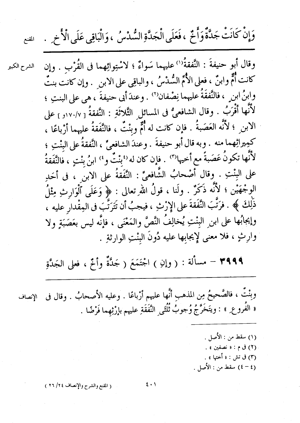 وبِنْتٌ، فالصَّحيحُ مِن المذهبِ أنَّها عليهم أرْباعًا. وعليه الأصحابُ. وقال فى «الفُروعِ»: ويتَخَرَّجُ وُجوبُ ثُلُثَىِ النَّفَقَةِ عليهم بإرْثِهِما فَرْضًا.