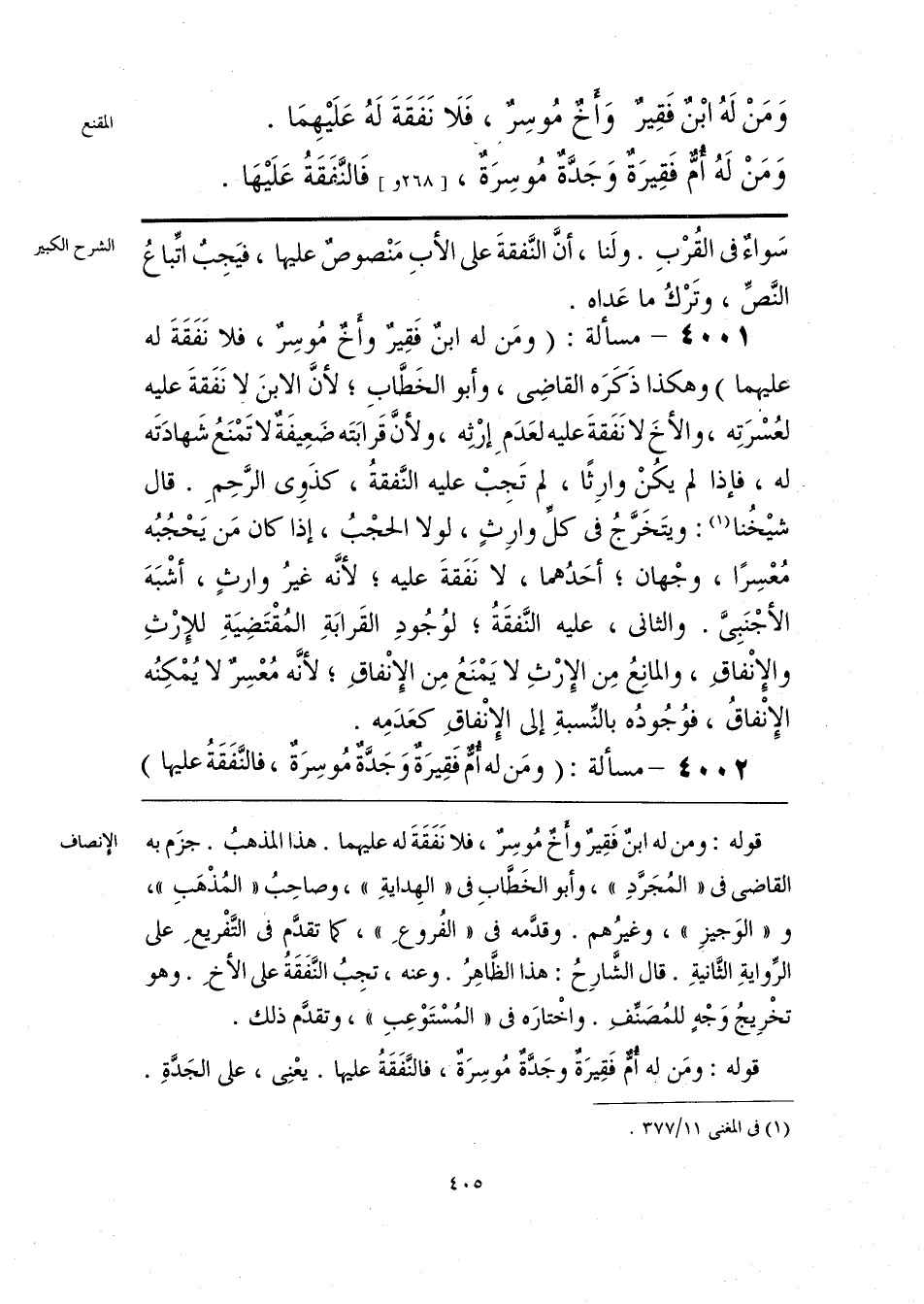 قوله: ومن له ابنٌ فَقِيرٌ وأَخٌ مُوسِرٌ، فلا نَفَقَةَ له عليهما. هذا المذهبُ. جزَم به القاضى فى «المُجَرَّدِ»، وأبو الخَطَّابِ فى «الهِدايَةِ»، وصاحِبُ «المُذْهَبِ»، و «الوَجيزِ»، وغيرُهم. وقدَّمه فى «الفُروعِ»، كما تقدُّم فى التَّفْريعِ على الرِّوايةِ الثَّانيةِ. قال الشَّارِحُ: هذا الظَّاهِرُ. وعنه، تجِبُ النَّفَقَةُ على الأخِ. وهو تخْرِيجُ وَجْهٍ للمُصَنِّفِ. واخْتارَه فى «المُسْتَوْعِبِ»، وتقدَّم ذلك.