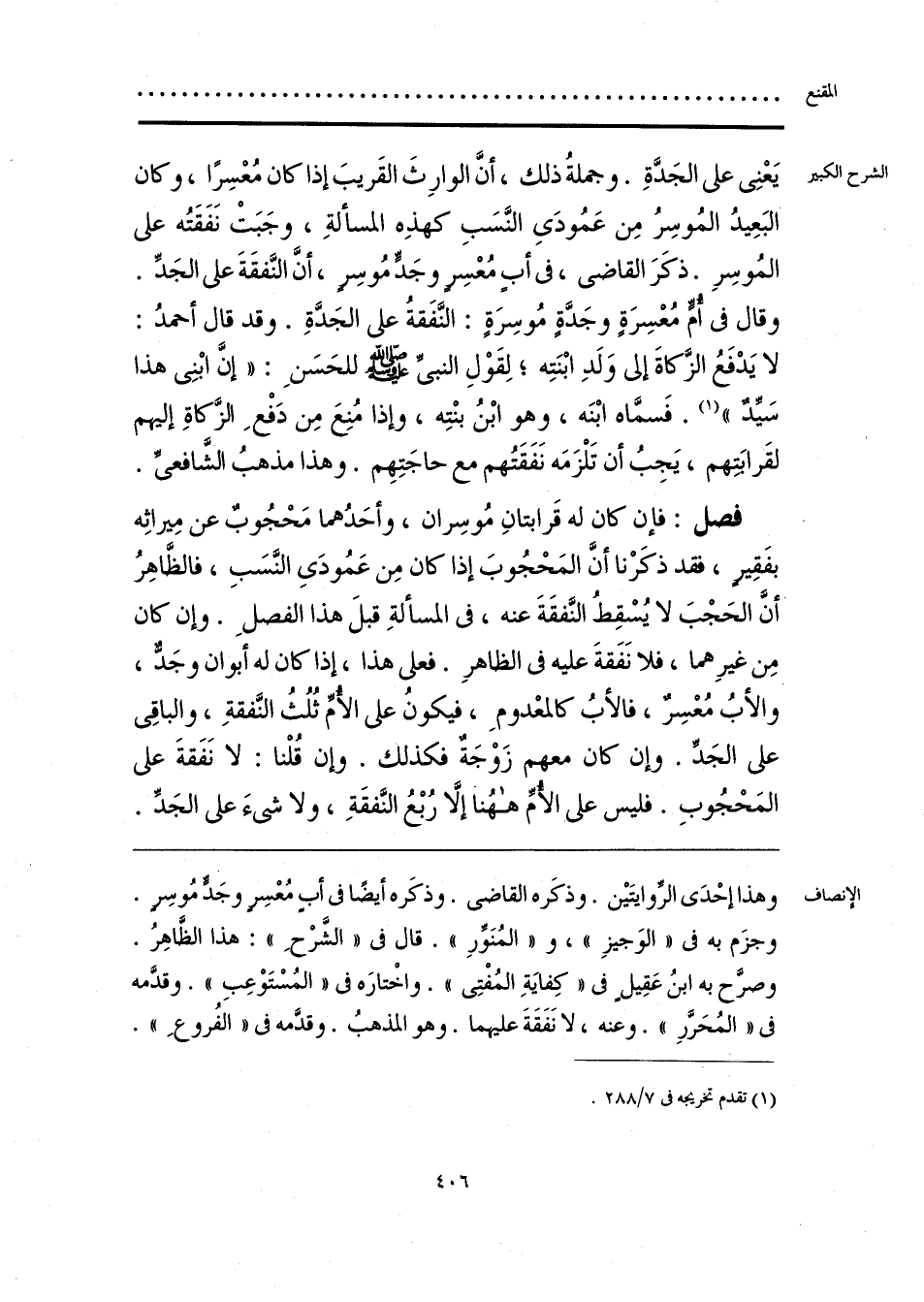 وهذا إحْدَى الرِّوايتَيْن. وذكَره القاضى. وذكَره أيضًا فى أبٍ مُعْسِر وجَدٍّ مُوسِرٍ. وجزَم به فى «الوَجيزِ»، و «المُنَوِّرِ». قال فى «الشَّرْحِ»: هذا الظَّاهِرُ. وصرَّح به ابنُ عَقِيلٍ فى «كِفايَةِ المُفْتِى». واخْتارَه فى «المُسْتَوْعِبِ». وقدَّمه فى «المُحَرَّرِ». وعنه، لا نَفَقَةَ عليهما. وهو المذهبُ. وقدَّمه فى «الفُروعِ».