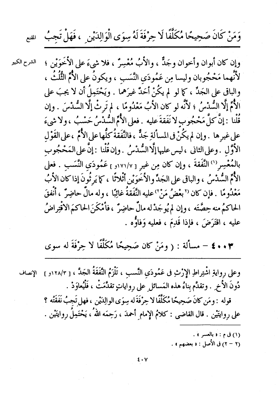 وعلى رِوايةِ اشْتِراطِ الإرْثِ فى عَمُودَىِ النَّسبِ، تَلْزَمُ النَّفَقَةُ الجَدَّ، دُونَ الأخِ. وتقدَّم بِناءُ هذه المَسائلِ على رِواياتٍ تقدَّمَتْ، فَلْيُعاوَدْ.