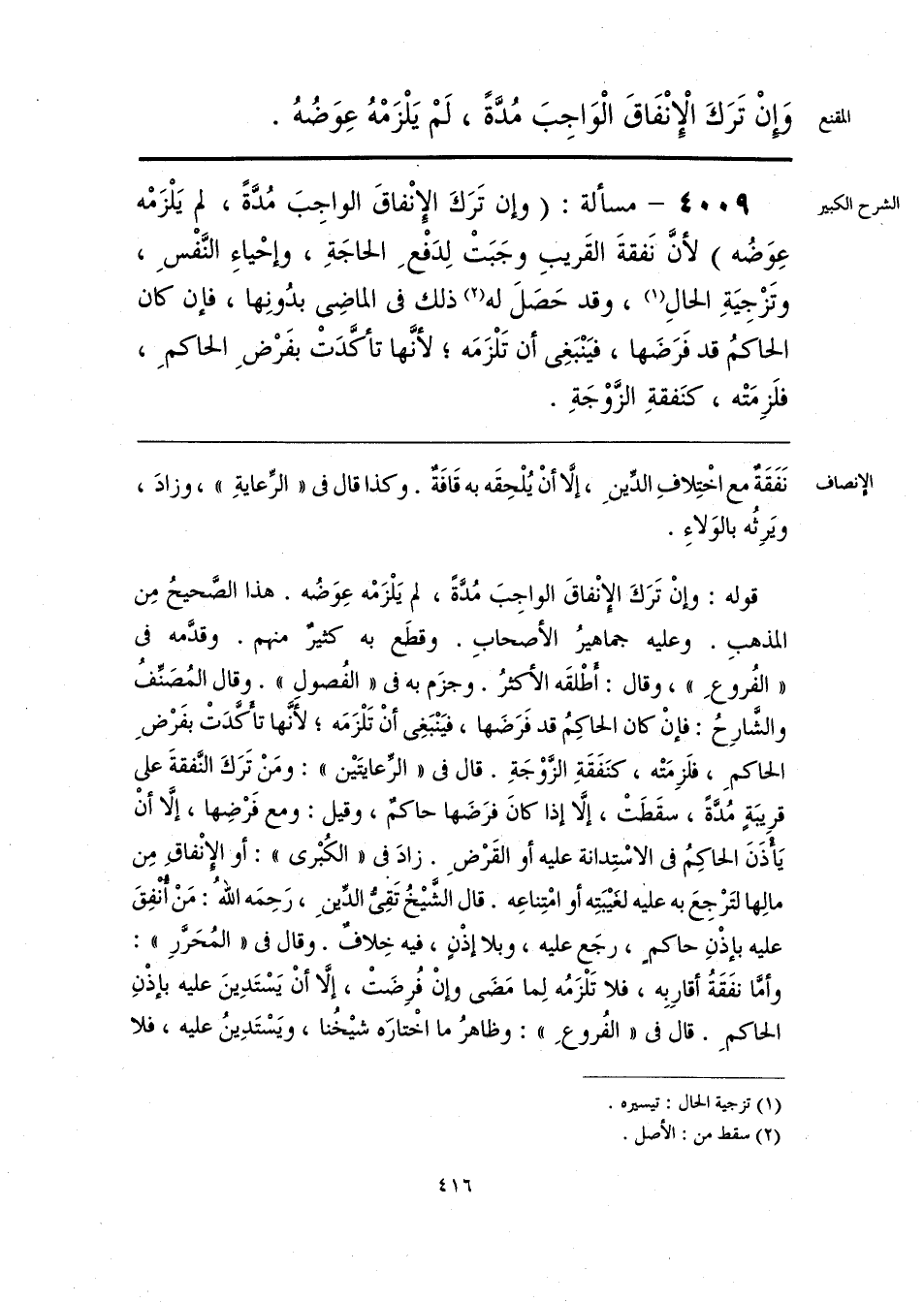 قوله: وإنْ تَرَكَ الإنْفاقَ الواجِبَ مُدَّةً، لم يَلْزَمْه عِوَضُه. هذا الصَّحيحُ مِن المذهبِ. وعليه جماهيرُ الأصحابِ. وقطَع به كثيرٌ منهم. وقدَّمه فى «الفُروعِ»، وقال: أَطلقَه الأكثرُ. وجزَم به فى «الفُصول». وقال المُصَنِّفُ والشَّارِحُ: فإنْ كان الحاكِمُ قد فَرَضَها، فيَنْبَغِى أَنْ تَلْزَمَه؛ لأَنَّها تأكَّدَتْ بفَرْضِ الحاكمِ، فلَزِمَتْه، كنَفَقَةِ الزَّوْجَةِ. قال فى «الرِّعايتَيْن»: ومَنْ تَرَكَ النَّفقةَ على قرِيبَةٍ مُدَّةً، سقَطَتْ، إلَّا إذا كانَ فرَضَها حاكمٌ، وقيل: ومع فَرْضِها، إلَّا أَنْ يَأْذَنَ الحاكِمُ فى الاسْتِدانة عليه أو القَرْضِ. زادَ فى «الكُبْرى»: أو الإنْفاقِ مِن مالِها لتَرْجِعَ به عليه لغَيْبَتِه أو امْتِناعِه. قال الشَّيْخُ تَقِىُّ الدِّينِ، رَحِمَه اللَّهُ: مَنْ أُنْفِقَ عليه بإذْنِ حاكم، رجَع عليه، وبلا إذْنٍ، فيه خِلافٌ. وقال فى «المُحَرَّرِ»: وأمَّا نفَقَةُ أقارِبِه، فلا تَلْزَمُه لِما مَضَى وإنْ فُرِضَتْ، إلَّا أَنْ يَسْتَدِينَ عليه بإذْنِ الحاكمِ. قال فى «الفُروعِ»: وظاهرُ ما اخْتاره شيْخُنا، ويَسْتَدِينُ عليه، فلا