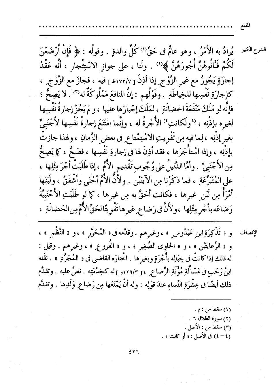 و «تَذْكِرَةِ ابنِ عَبْدُوسٍ»، وغيرِهم. وقدَّمه فى «المُحَرَّرِ»، و «النَّظْمِ»، و «الرِّعايتَيْن»، و «الحاوِى الصَّغِيرِ»، و «الفُروعِ»، وغيرِهم. وقيل: له ذلك إذا كانتْ فى حِبَالِه بأُجْرَةٍ وبغيرِها. اخْتارَه القاضى فى «المُجَرَّدِ». نقَله ابنُ رَجَبٍ فى مَسْألةِ مُؤْنَةِ الرَّضاعِ، له كخِدْمَتِه. نصَّ عليه. وتقدَّم ذلك أيضًا فى عِشْرَةِ النِّساءِ عندَ قوْلِه: وله أَنْ يَمْنَعَها مِن رَضاعِ وَلَدِها. وتقدَّم