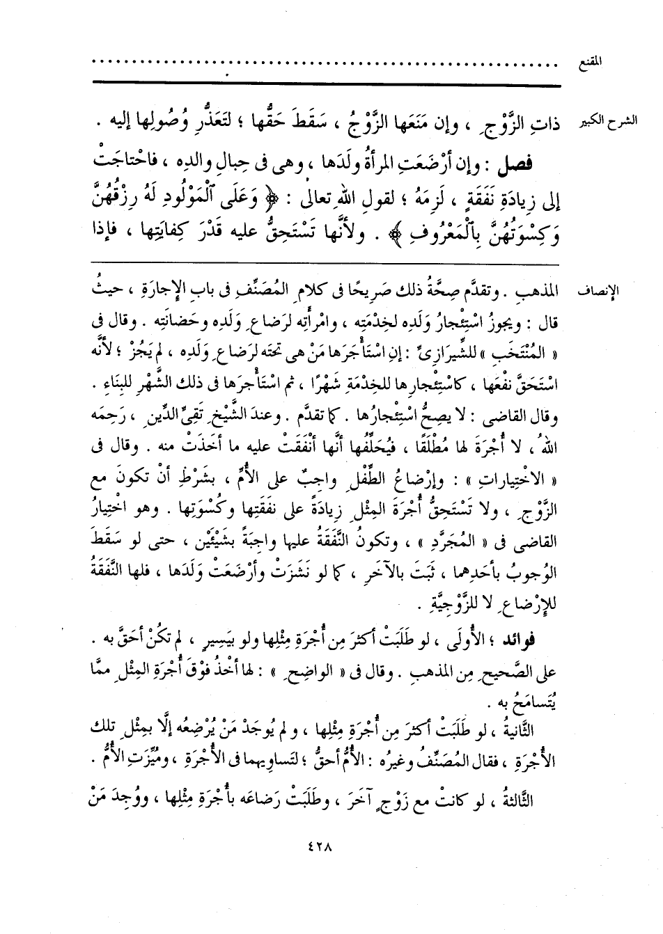 المذهبِ. وتقدَّم صِحَّةُ ذلك صَرِيحًا فى كلامِ المُصَنِّفِ فى بابِ الإِجارَةِ، حيثُ قال: ويجوزُ اسْتِئْجارُ وَلَدِه لخِدْمَتِه، وامْرأَتِه لرَضاعِ وَلَدِه وحَضانَتِه. وقال فى «المُنْتَخَبِ» للشِّيرَازِىِّ: إنِ اسْتَأْجَرَها مَنْ هى تحتَه لرَضاعِ وَلَدِه، لم يَجُزْ؛ لأنَّه اسْتَحَقَّ نفعَها، كاسْتِئْجارِها للخِدْمَةِ شَهْرًا، ثم اسْتَأْجرَها فى ذلك الشَّهْرِ للبِنَاءِ. وقال القاضى: لا يصحُّ اسْتِئْجارُها. كما تقدَّم. وعندَ الشَّيْخِ تَقِىِّ الدِّينِ، رَحِمَه اللَّهُ، لا أُجْرَةَ لها مُطْلَقًا، فيُحَلِّفُها أنَّها أنْفَقَتْ عليه ما أخَذَت منه. وقال فى «الاخْتِياراتِ»: وإرْضاعُ الطِّفْلِ واجِبٌ على الأُمِّ، بشَرْط أَنْ تكونَ مع الزَّوْجِ، ولا تَسْتَحِقُّ أُجْرَةَ المِثْلِ زِيادَةً على نفَقَتِها وكُسْوَتِها. وهو اختِيارُ القاضى فى «المُجَرَّدِ»، وتكونُ النَّفَقَةُ عليها واجِبَةً بشَيْئَيْن، حتى لو سَقَطَ الوُجوبُ بأحَدِهما، ثَبَتَ بالآخَرِ، كما لو نَشَزَتْ وأرْضَعَتْ وَلَدَها، فلها النَّفَقَةُ للإِرْضاعَ لا للزَّوْجِيَّةِ.