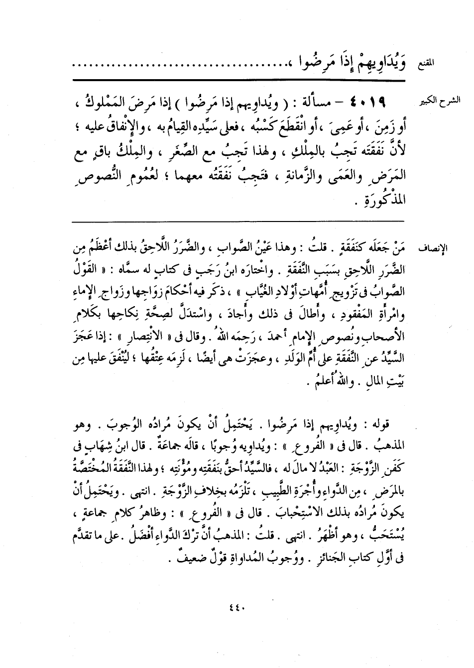 قوله: ويُداوِيهم إذا مَرِضُوا. يَحْتَمِلُ أَنْ يكونَ مُرادُه الوُجوبَ. وهو المذهبُ. قال فى «الفُروعِ»: ويُداوِيه وُجوبًا، قالَه جماعَةٌ. قال ابنُ شِهَابٍ فى كَفَنِ الزَّوْجَةِ. العَبْدُ لا مالَ له، فالسَّيِّدُ أحقُّ بنَفَقَتِه ومُؤْنَتِه؛ ولهذا النَّفَقَةُ المُخْتَصةُ بالمرَضِ، مِن الدَّواءِ وأُجْرَةِ الطيبِ، تَلْزَمُه بخِلافِ الزَّوْجَةِ. انتهى. ويَحْتَمِلُ أَنْ يكونَ مُرادُه بذلك الاسْتِحْبابَ. قال فى «الفُروعِ»: وظاهرُ كلامِ جماعةٍ، يُسْتَحَبُّ، وهو أظْهَرُ. انتهى. قلتُ: المذهبُ أنَّ ترْكَ الدَّواءِ أفْضَلُ. على ما تقدَّم فى أوَّلِ كتابِ الجَنائزِ. ووُجوبُ المُداواةِ قوْلٌ ضعيفٌ.