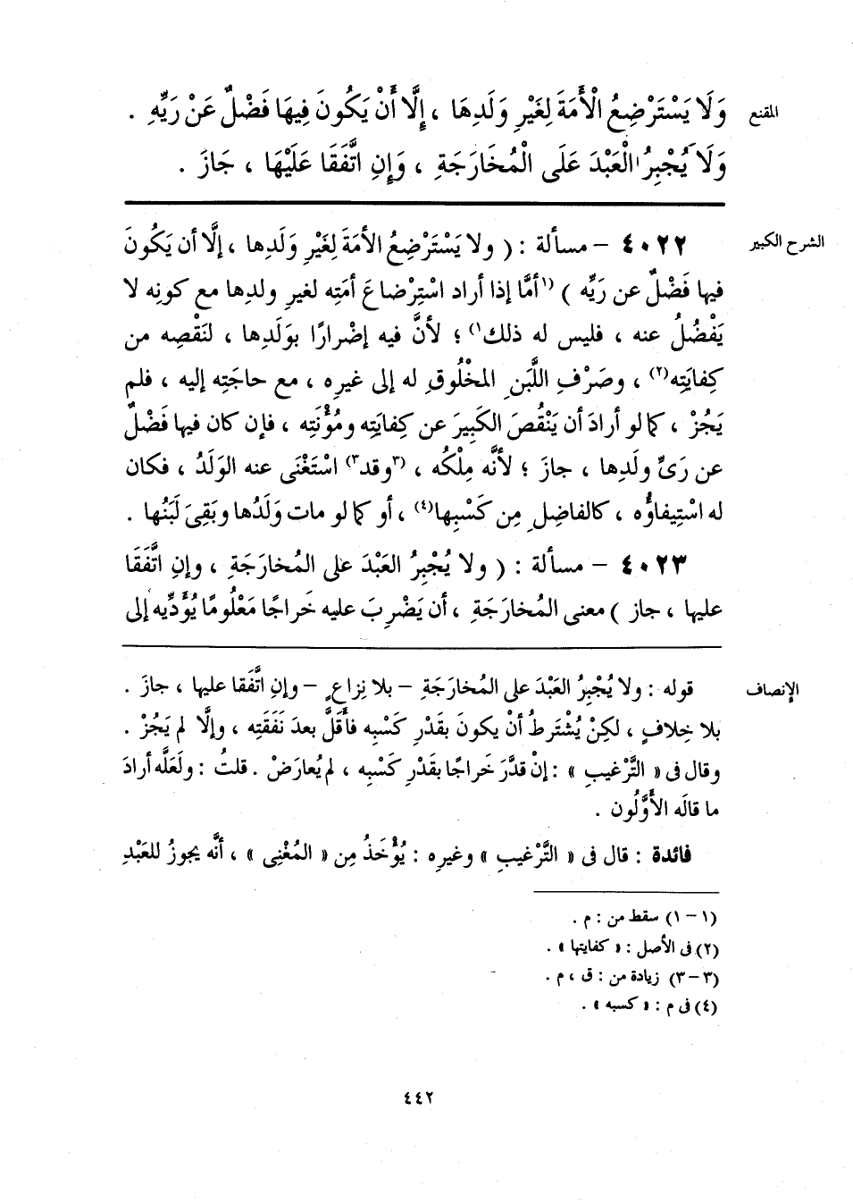 وَلَا يَسْتَرْضِعُ الْأَمَةَ لِغَيْرِ وَلَدِهَا، إِلَّا أَنْ يَكُونَ فِيهَا فَضْلٌ عَنْ رَيِّهِ. وَلَاَ يُجْبِرُ الْعَبْدَ عَلَى الْمُخَارَجَةِ، وَإِنِ اتَّفَقَا عَلَيْهَا، جَازَ.