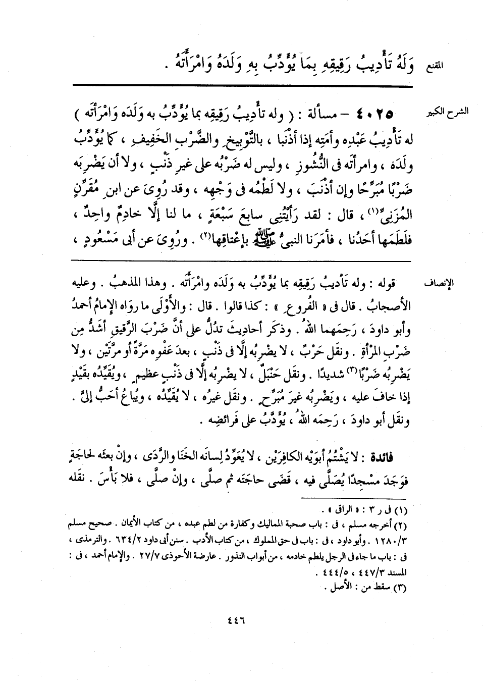 قوله: وله تَأديبُ رَقِيقِه بما يُؤَدِّبُ به وَلَدَه وامْرَأَته. وهذا المذهبُ. وعليه الأصحابُ. قال فى «الفُروعِ»: كذا قالوا. قال: والأَوْلَى ما روَاه الإِمامُ أحمدُ وأبو داودَ، رَحِمَهما اللَّهُ. وذكَر أحادِيثَ تدُلُّ على أنَّ ضَرْبَ الرَّقيقِ أشَدُّ مِن ضَرْبِ المرْأةِ. ونقَل حَرْبٌ، لا يضْرِ بُه إلَّا فى ذَنْبٍ، بعدَ عَفْوِه مَرَّةً أو مرَّتَيْن، ولا يَضْرِبُه ضَرْبًا (¬1) شديدًا. ونقَل حَنْبَلٌ، لا يضْرِبُه إلَّا فى ذَنْبٍ عظيمٍ، ويُقَيِّدُه بقَيْدٍ إذا خافَ عليه، ويَضْرِبُه غيرَ مُبَرِّحٍ. ونقَل غيرُه، لا يُقَيِّدُه، ويُباعُ أحَبُّ إلىَّ. ونقَل أبو داودَ، رَحِمَه اللَّهُ، يُؤَدَّب على فَرائضِه.