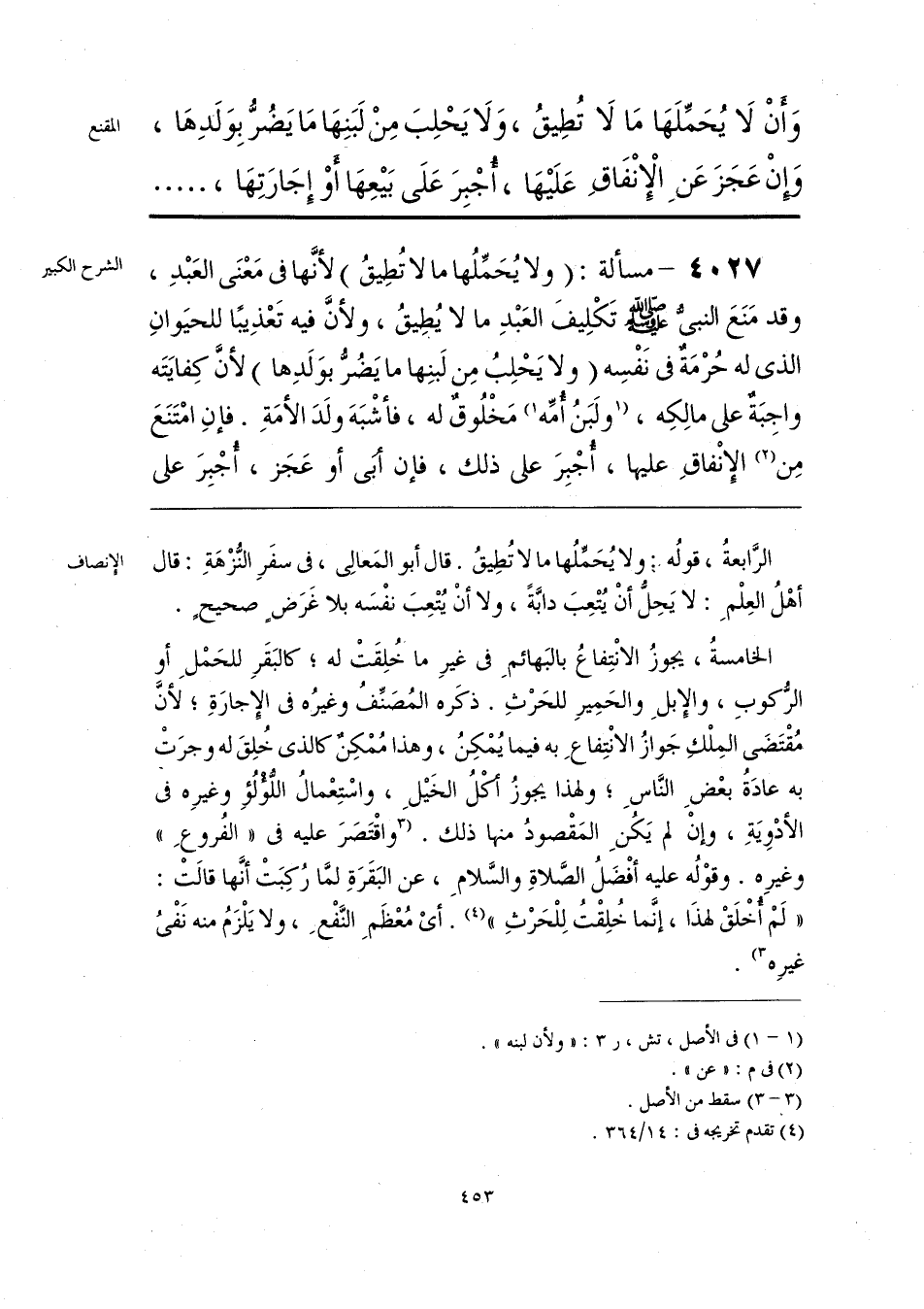 الرَّابعةُ، قولُه: ولا يُحَمِّلُها ما لا تُطِيقُ. قال أبو المَعالِى، فى سفَرِ النُّزْهَةِ: قال أهْلُ العِلْمِ: لا يَحِلُّ أَنْ يُتْعِبَ دابَّةً، ولا أَنْ يُتْعِبَ نفْسَه بلا غَرَضٍ صحيحٍ.
