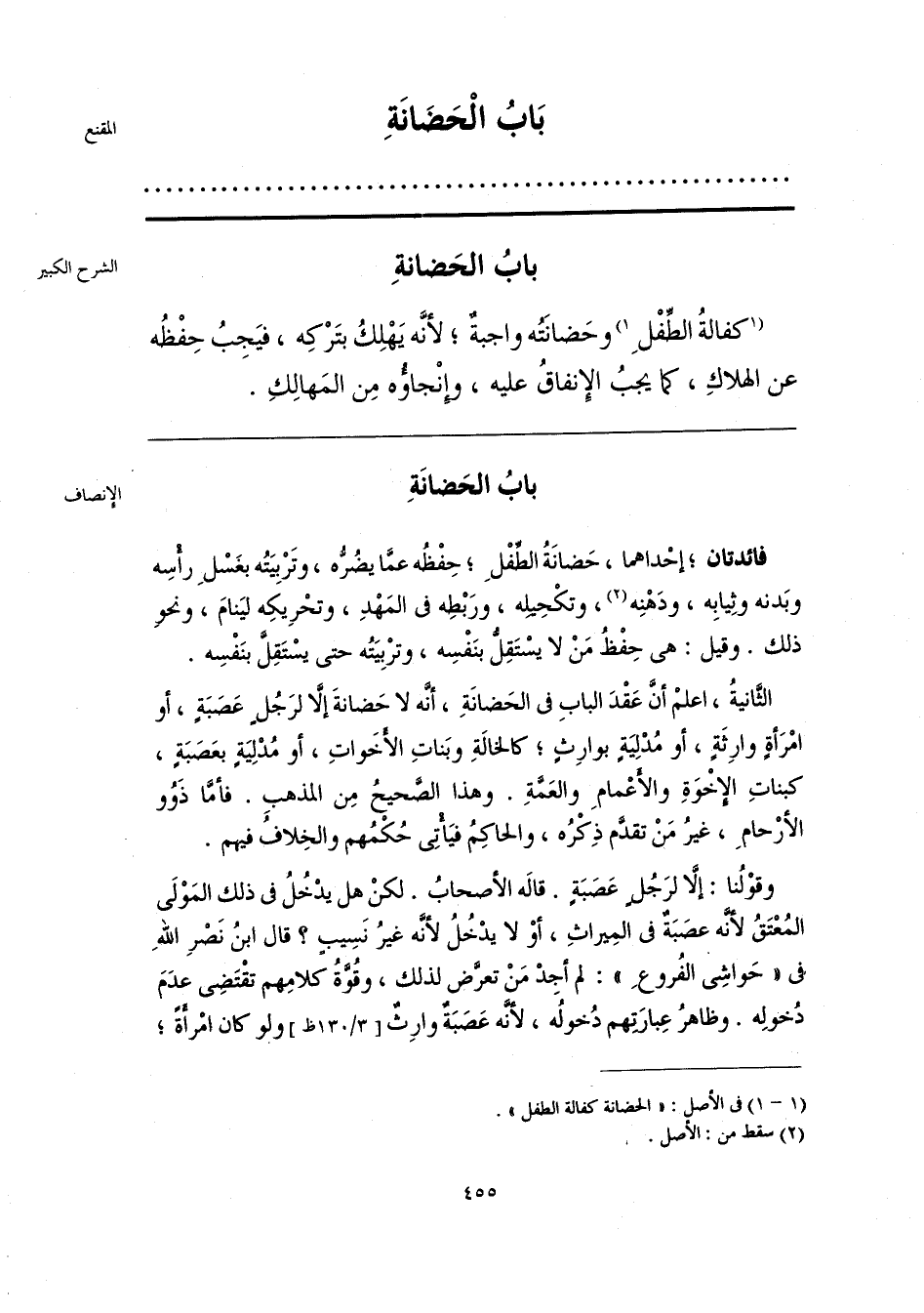 الثَّانيةُ، اعلمْ أنَّ عَقْدَ البابِ فى الحَضانَةِ، أنَّه لا حَضانةَ إلَّا لرَجُلٍ عَصَبَةٍ، أو امْرَأةٍ وارِثَةٍ، أو مُدْلِيَةٍ بوارِثٍ؛ كالخالَةِ وبَناتِ الأَخَواتِ، أو مُدْلِيَةٍ بعَصَبَةٍ، كبناتِ الإخوَةِ والأَعْمامِ والعَمَّةِ. وهذا الصَّحيحُ مِن المذهبِ. فأمَّا ذَوُو الأَرْحامِ، غيرُ مَنْ تقدَّم ذِكْرُه، والحاكِمُ فيَأْتِى حُكْمُهم والخِلافُ فيهم.