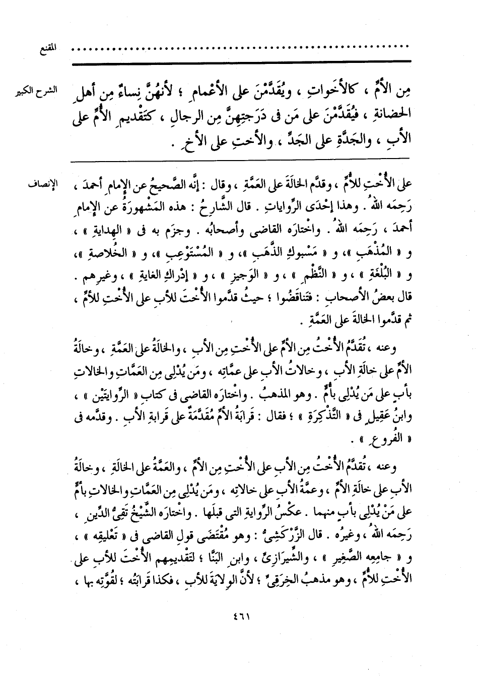 على الأُخْتِ للأُمِّ، وقدَّم الخالَةَ على العَمَّةِ، وقال: إنَّه الصَّحيحُ عن الإِمامِ أحمدَ، رَحِمَه اللَّهُ. وهذا إحْدَى الرِّواياتِ. قال الشَّارِحُ: هذه المَشْهورَةُ عن الإِمامِ أحمدَ، رَحِمَه اللَّهُ. واخْتارَه القاضى وأصحابُه. وجزَم به فى «الهِدايَةِ»، و «المُذْهَبِ»، و «مَسْبوكِ الذَّهبِ»، و «المُسْتَوْعِبِ»، و «الخُلاصةِ»، و «البُلْغَةِ»، و «النَّظْمِ»، و «الوَجيزِ»، و «إِدْراكِ الغايةِ»، وغيرِهم. قال بعضُ الأصحابِ: فتَناقَضُوا؛ حيثُ قدَّموا الأُخْتَ للأبِ على الأُخْتِ للأمِّ، ثم قدَّموا الخالةَ على العَمَّةِ.