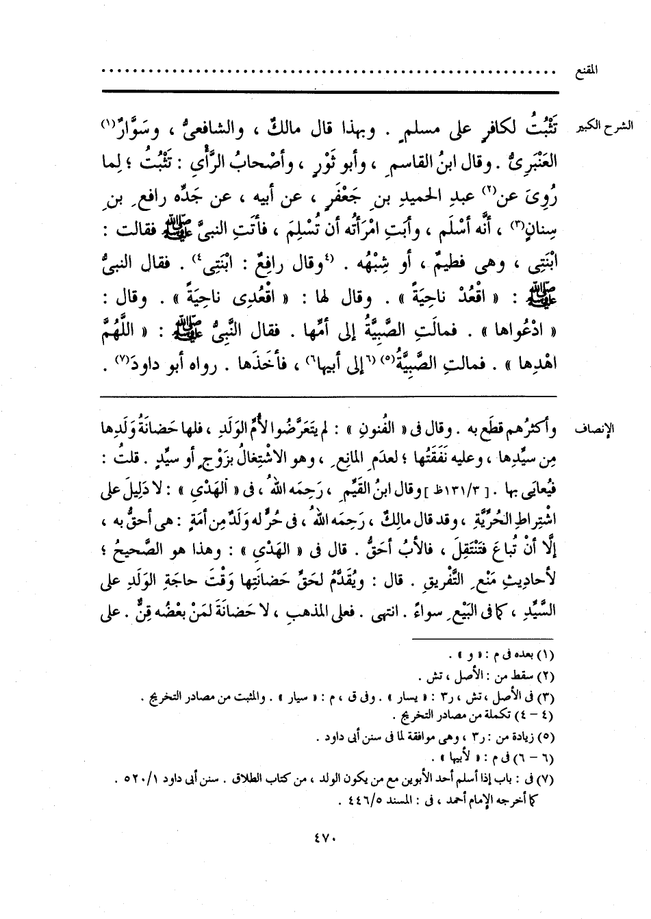 وأكثرُهم قطَع به. وقال فى «الفُنونِ»: لم يتَعَرَّضُوا لأم الوَلَدِ، فلها حَضانَةُ وَلَدِها مِن سيِّدِها، وعليه نَفَقَتُها؛ لعدَمِ المانِعِ، وهو الاشْتِغالُ بزَوجٍ أو سيِّدٍ. قلتُ: فيُعايَى بها. وقال ابنُ القَيِّمِ، رَحِمَه اللَّهُ، فى «الهَدْى»: لا دَلِيلَ على اشْتِراطِ الحُرِّيَّةِ، وقد قال مالِكٌ، رَحِمَه اللَّهُ، فى حُرٍّ له وَلَدٌ مِن أمَةٍ: هى أحقُّ به، إلا أن تُباعَ فتَنْتَقِلَ، فالأبُ أحَقُّ. قال فى «الهَدْى»: وهذا هو الصَّحيحُ؛ لأحادِيثِ مَنْعِ التَّفْريقِ. قال: ويُقَدَّمُ لحَق حَضانَتِها وَقتَ حاجَةِ الوَلَدِ على السَّيِّدِ، كما فى البَيْعِ سواءً. انتهى. فعلى المذهبِ، لا حَضانَةَ لمَنْ بعْضُه قِنٌّ. على