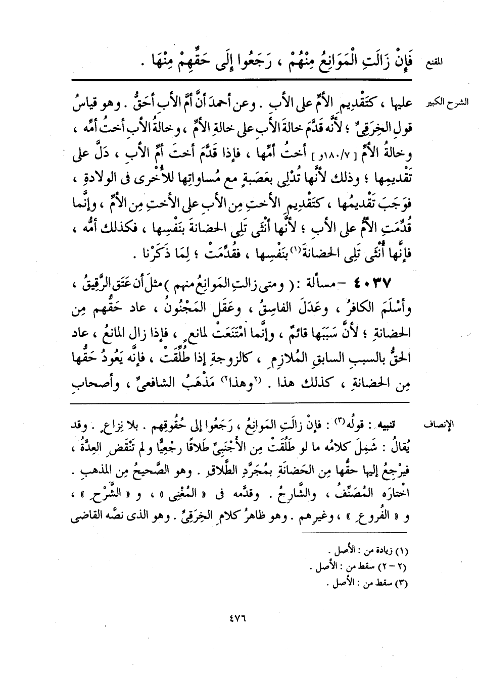 تنبيه: قولُه (¬1): فإنْ زالَتِ المَوانِعُ، رَجَعُوا إلى حُقُوقِهم. بلا نِزاعٍ. وقد يُقالُ: شَمِلَ كلامُه ما لو طَلُقَتْ مِن الأَجْنَبِىِّ طَلاقًا رجْعِيًّا ولم تَنْقَضِ العِدَّةُ، فيرْجِعُ إليها حقُّها مِن الحَضانَةِ بمُجَردِ الطَّلاقِ. وهو الصَّحيحُ مِن المذهبِ. اخْتارَه المُصَنِّفُ، والشَّارِحُ. وقدَّمه فى «المُغْنِى»، و «الشَّرْحِ»، و «الفُروعِ»، وغيرِهم. وهو ظاهرُ كلامِ الخِرَقىِّ. وهو الذى نصَّه القاضى