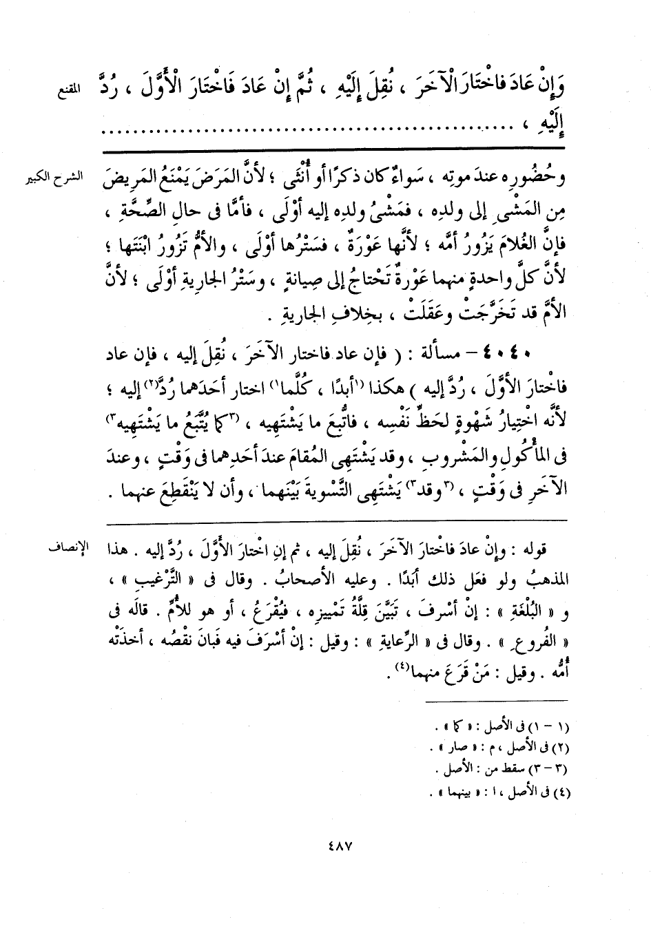 قوله: وإنْ عادَ فاخْتارَ الآخَرَ، نُقِلَ إليه، ثم إنِ اخْتارَ الأوَّلَ، رُدَّ إليه. هذا المذهبُ ولو فعَل ذلك أَبَدًا. وعليه الأصحابُ. وقال فى «التَّرْغيبِ»، و «البُلْغَةِ»: إنْ أسْرفَ، تَبَيَّنَ قِلةُ تَمْييزِه، فيُقْرَعُ، أو هو للأُمِّ. قالَه فى «الفُروعِ». وقال فى «الرِّعَايَةِ»: وقيل: إنْ أسْرَفَ فيه فَبانَ نقْصُه، أخذَتْه أُمُّه. وقيل: مَنْ قَرَعَ منهما (¬1).