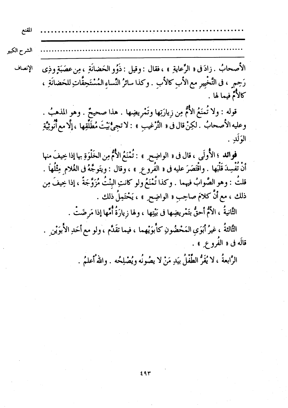 فوائد؛ الأُولَى، قال فى «الواضِحِ»: تُمْنَعُ الأُمُّ مِن الخَلْوَةِ بها إذا خِيفَ منها أَنْ تُفْسِدَ قَلْبَها. واقْتَصَرَ عليه فى «الفُروعِ»، وقال: ويتَوجَّهُ فى الغُلامِ مِثْلُها. قلتُ: وهو الصَّوابُ فيهما. وكذا تُمْنَعُ ولو كانتِ البِنْتُ مُزَوَّجَة، إذا خِيفَ مِن ذلك، مع أنَّ كلامَ صاحِبِ «الواضِحِ»، يَحْتَمِلُ ذلك.