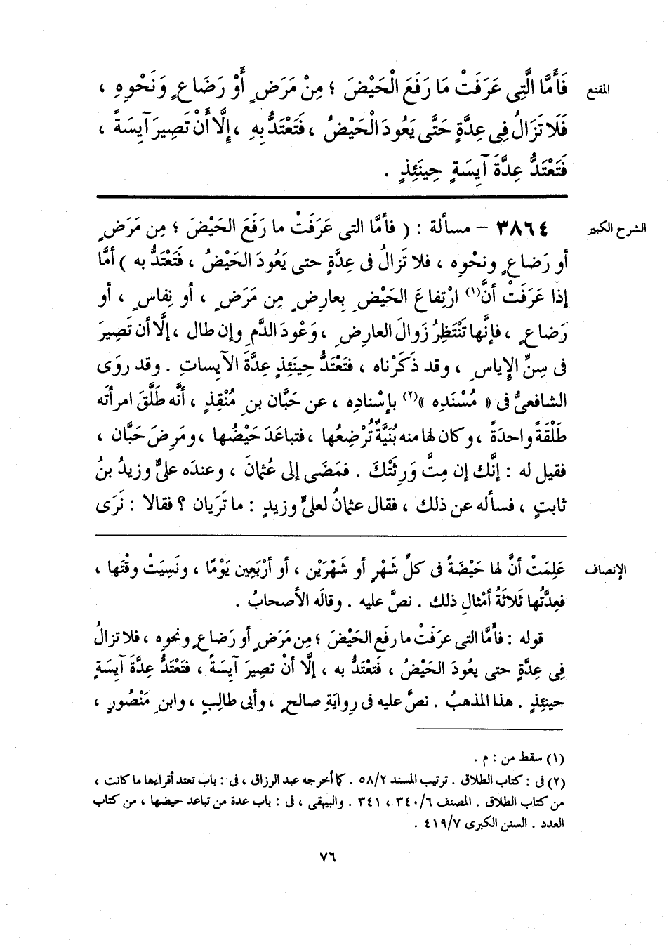 قوله: فأمَّا التي عرَفَتْ ما رفَعِ الحَيضَ؛ مِن مَرَض أو رَضاعٍ ونحوه، فلا تزالُ في عِدَّةٍ حتى يعُودَ الحَيضُ، فتعْتَدُّ به، إلا أنْ تصِيرَ آيِسَةً، فتَعْتَدُّ عِدَّةَ آيِسَةٍ حينئِذٍ. هذا المذهبُ. نصَّ عليه في رِوايَةِ صالحٍ، وأبي طالِبٍ، وابنِ مَنْصُورٍ،