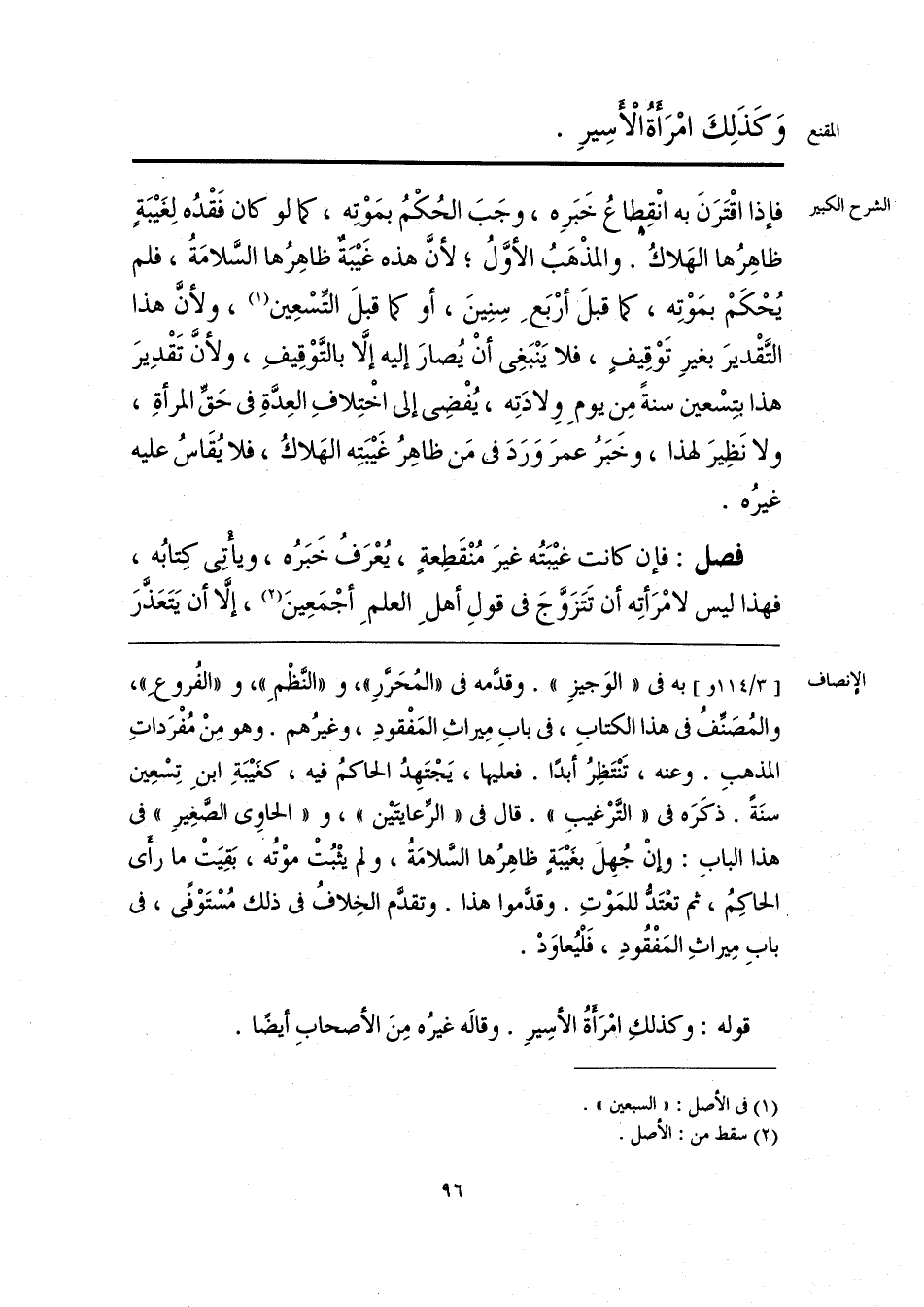 به في «الوَجيزِ». وقدَّمه في «المُحَرَّرِ»، و «النَّظْمِ»، و «الفُروعِ»، والمُصَنفُ في هذا الكتاب، في بابِ مِيراثِ المَفْقودِ، وغيرُهم. وهو مِنْ مُفْرَداتِ المذهبِ. وعنه، تَنْتَظِرُ أَبدًا. فعليها، يَجْتَهِدُ الحاكمُ فيه، كغَيبَةِ ابنِ تِسْعِين سنَةً. ذكَرَه في «الترْغيبِ». قال في «الرِّعايتَين»، و «الحاوي الصغِيرِ» في هذا البابِ: وإنْ جُهِلَ بغَيبَةٍ ظاهِرُها السَّلامَةُ، ولم يثْبُتْ موْتُه، بَقِيَتْ ما رأى الحاكِمُ، ثم تعْتَدُّ للمَوْتِ. وقدموا هذا. وتقدم الخِلافُ في ذلك مُسْتَوْفى، في بابِ مِيراثِ المَفْقُودِ، فَلْيُعاوَدْ.