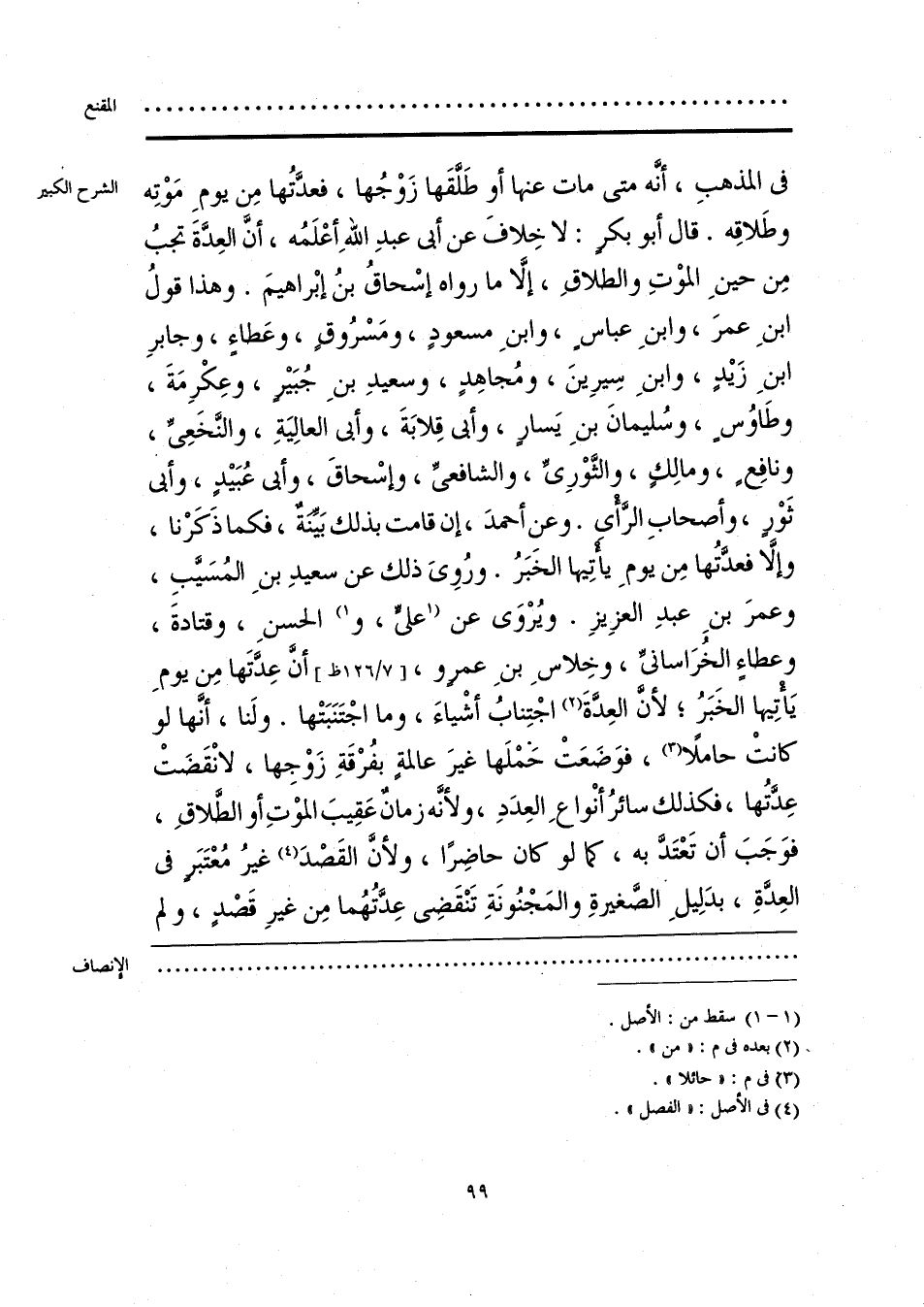 في المذهبِ، أنَّه متى مات عنها أو طَلَّقَها زَوْجُها، فعدَّتُها مِن يومِ مَوْتِه وطَلاقِه. قال أبو بكر: لا خِلافَ عن أبي عبدِ اللهِ أعْلَمُه، أنَّ العِدَّةَ تجبُ مِن حينِ الموْتِ والطلاقِ، إلَّا ما رواه إسْحاقُ بنُ إبْراهيمَ. وهذا قولُ ابنِ عمرَ، وابنِ عباس، وابنِ مسعودٍ، ومَسْرُوق، وعطاء، وجابرِ بنِ زَيدٍ، وابنِ سِيرِينَ، ومُجاهِدٍ، وسعيدِ بنِ جُبَير، وعِكْرِمَةَ، وطَاوُس، وسُليمانَ بنِ يَسارٍ، وأبي قِلابَةَ، وأبي العالِيَةِ، والنَّخَعِيِّ، ونافِعٍ، ومالِكٍ، والثَّوْرِيِّ، والشافعيِّ، وإسْحاقَ، وأبي عُبَيدٍ، وأبي ثَوْرٍ، وأصحابِ الرَّأي. وعن أحمدَ، إن قامت بذلك بَينةٌ، فكما ذَكَرْنا، وإلَّا فعدَّتُها مِن يومِ يأتِيها الخَبَرُ. ورُوِيَ ذلك عن سعيدِ بنِ المُسَيَّبِ، وعمرَ بنِ عبدِ العزِيزِ. ويُرْوَى عن [عليٍّ، و] (¬1) الحسنِ، وقتادةَ، وعطاءٍ الخُرَاساني، وخِلاسِ بنِ عمرو، أنَّ عِدتَها مِن يومِ يَأتِيها الخَبَرُ؛ لأنَّ العِدةَ (¬2) اجْتِنابُ أشْياءَ، وما اجْتَنَبَتْها. ولَنا، أنها لو كانتْ حاملًا (¬3)، فوَضَعَتْ حمْلَها غيرَ عالمةٍ بفُرْقَةِ زَوْجِها، لانْقَضَتْ عِدَّتُها، فكذلك سائرُ أنْواعِ العِدَدِ، ولأنَّه زمانٌ عَقِيبَ الموْتِ أو الطَّلاقِ، فوَجَبَ أن تَعْتَد به، كما لو كان حاضِرًا، ولأنَّ القَصْدَ (¬4) غيرُ مُعْتَبَرٍ في العِدَّةِ، بدَلِيلِ الصَّغيرةِ والمَجْنُونَةِ تَنْقَضِي عِدَّتُهُما مِن غيرِ قَصْدٍ، ولم