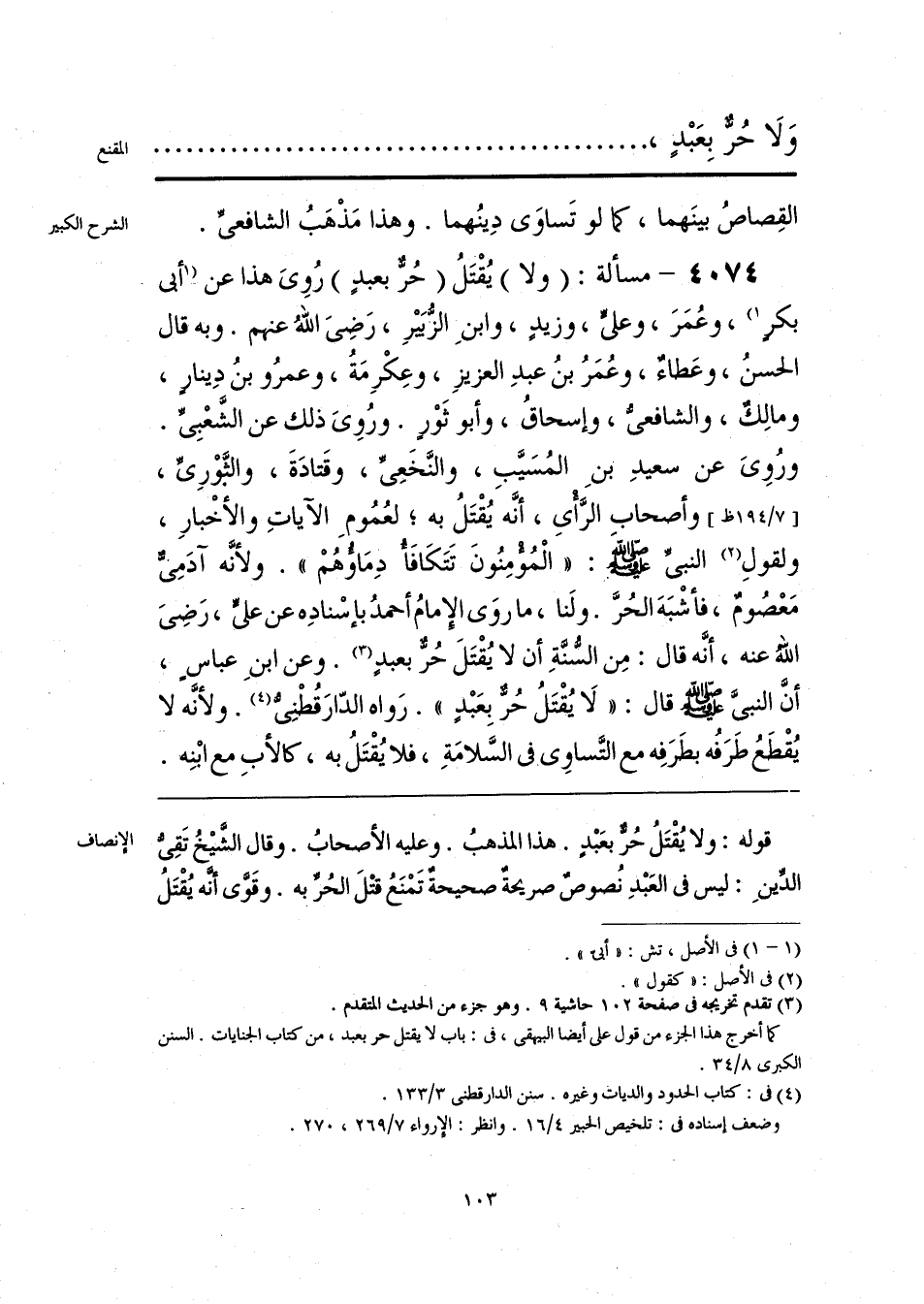 قوله: ولا يُقْتَلُ حُرٌّ بعَبْدٍ. هذا المذهبُ. وعليه الأصحابُ. وقال الشَّيْخُ تَقِىُّ الدِّينِ: ليس فى العَبْدِ نُصوصٌ صريحةٌ صحيحةٌ تَمْنَعُ قتْلَ الحُرِّ به. وقَوَّى أنَّه يُقْتَلُ