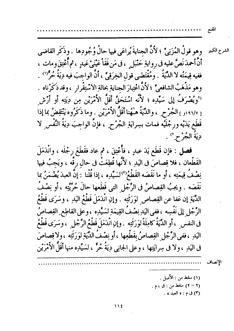 وهو قولُ المُزَنِىِّ؛ لأَنَّ الجِنايةَ يُراعَى فيها حالُ وُجُودِها. وذَكَر القاضى أنَّ أحمدَ نَصَّ عليه في رِوايةِ حَنْبَلٍ، في مَن فَقَأ عَيْنَىْ عَبدٍ، ثم أُعْتِقَ ومات، ففيه قِيمَتُه لا الدِّيَةُ. ومُقْتَضَى قولِ الخِرَقِىِّ، أنَّ الواجِبَ فيه دِيَةُ حُرٍّ (¬1). وهو مَذْهَبُ الشافعىِّ؛ لأَنَّ اعْتِبارَ الجِنايةِ بحالةِ الاسْتِقْرارِ، وقد ذَكَرْناه. [ويُصْرَفُ إلى سَيِّدِه؛ لأنَّه اسْتَحَقَّ أقَلَّ الأَمْرَيْن مِن دِيَتِه أو أرْشِ الجُرْحِ، والدِّيَةُ ههُنا أقَلُّ الأَمْرَيْن. وما ذَكَرُوه يَنْتَقِضُ بما إذا قَطَع يَدَيْه ورِجْلَيْه فمات بسِرايَةِ الجُرْحِ، فإنَّ الواجِبَ دِيَةُ النَّفْسِ لا دِيَةُ الجُرْحِ] (¬2).