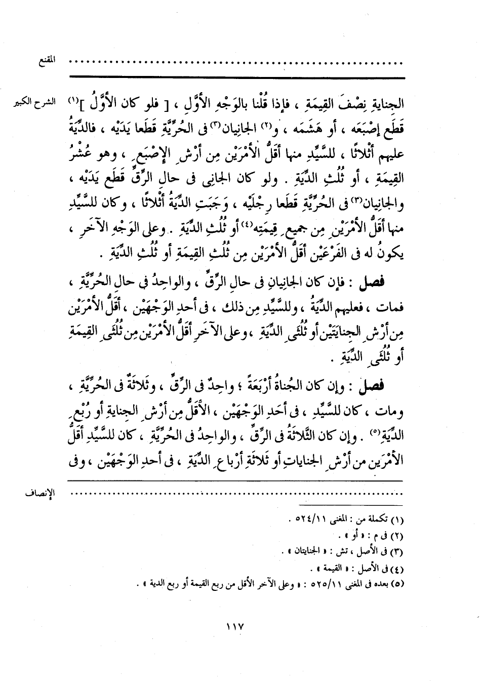 (¬5) بعده في المغنى 11/ 525: «وعلى الآخر الأقل من ربع القيمة أو ربع الدية».