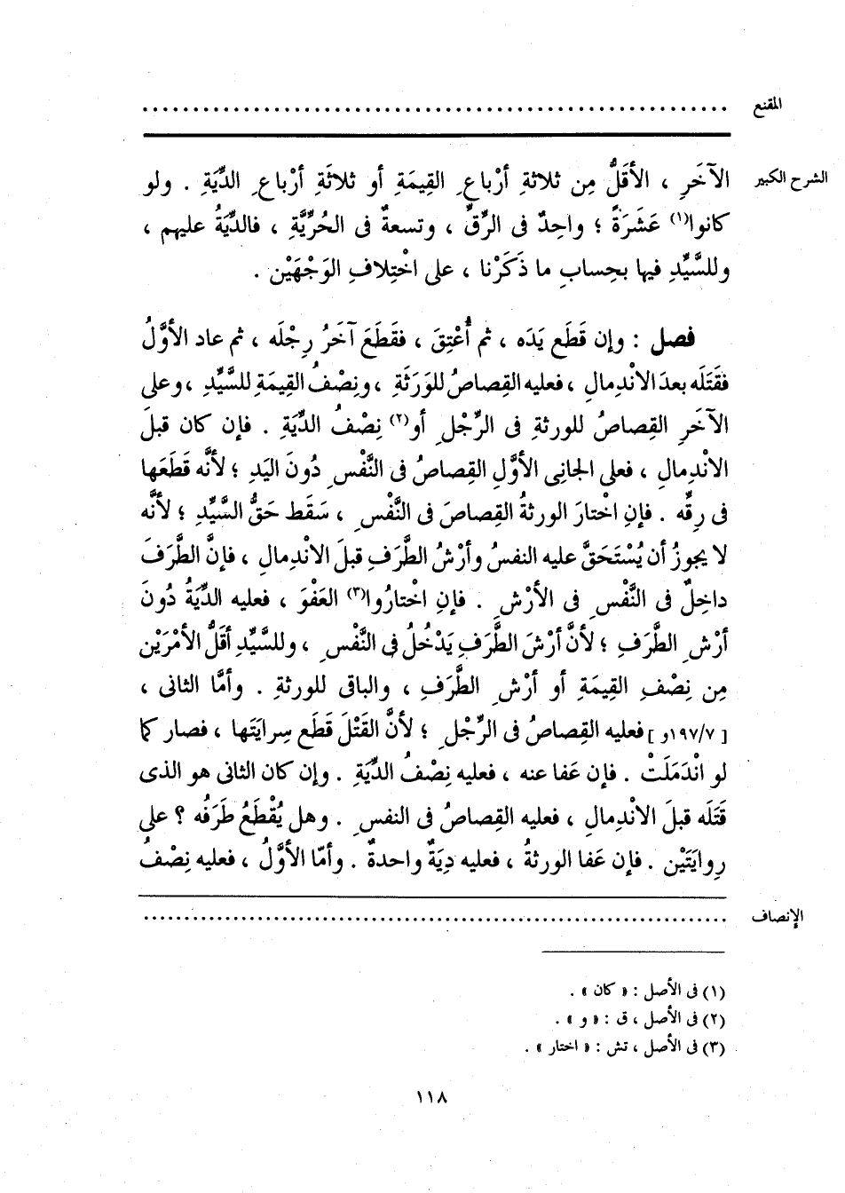 فصل: وإن قَطَع يَدَه، ثم أُعْتِقَ، فقَطَعَ آخَرُ رِجْلَه، ثم عاد الأَوَّلُ فقَتَلَه بعدَ الانْدِمالِ، فعليه القِصاصُ للوَرَثَةِ، ونِصْفُ القِيمَةِ للسَّيِّدِ، وعلى الآخَرِ القِصاصُ للورثةِ في الرِّجْلِ أو (¬2) نِصْفُ الدِّيَةِ. فإن كان قبلَ الانْدِمالِ، فعلى الجانِى الأَوَّلِ القِصاصُ في النَّفْسِ دُونَ اليَدِ؛ لأنَّه قَطَعَها في رِقِّه. فإنِ اخْتارَ الورثةُ القِصاصَ في النَّفْسِ، سَقَط حَقُّ السَّيِّدِ؛ لأنَّه لا يجوزُ أن يُسْتَحَقَّ عليه النفسُ وأرْشُ الطَّرَفِ قبلَ الانْدِمالِ، فإنَّ الطَّرَفَ داخِلٌ في النَّفْسِ في الأَرْشِ. فإنِ اخْتارُوا (¬3) العَفْوَ، فعليه الدِّيَةُ دُونَ أرْشِ الطَّرَفِ؛ لأَنَّ أرْشَ الطَّرفِ يَدْخُلُ في النَّفْسِ، وللسَّيِّدِ أقَلُّ الأَمْرَيْن مِن نِصْفِ القِيمَةِ أو أرْشِ الطَّرَفِ، والباقى للورثةِ. وأمَّا الثانى، فعليه القِصاصُ في الرِّجْلِ؛ لأَنَّ القَتْلَ قَطَع سِرايَتَها، فصار كما لو انْدَمَلَتْ. فإن عَفا عنه، فعليه نِصْفُ الدِّيَةِ. وإن كان الثانى هو الذى قَتَلَه قبلَ الانْدِمالِ، فعليه القِصاصُ في النفسِ. وهل يُقْطَعُ طَرَفُه؟ على رِوايَتَيْن. فإن عَفا الورثةُ، فعليهْ دِيَةٌ واحدةٌ. وأمّا الأَوَّلُ، فعليه نِصْف