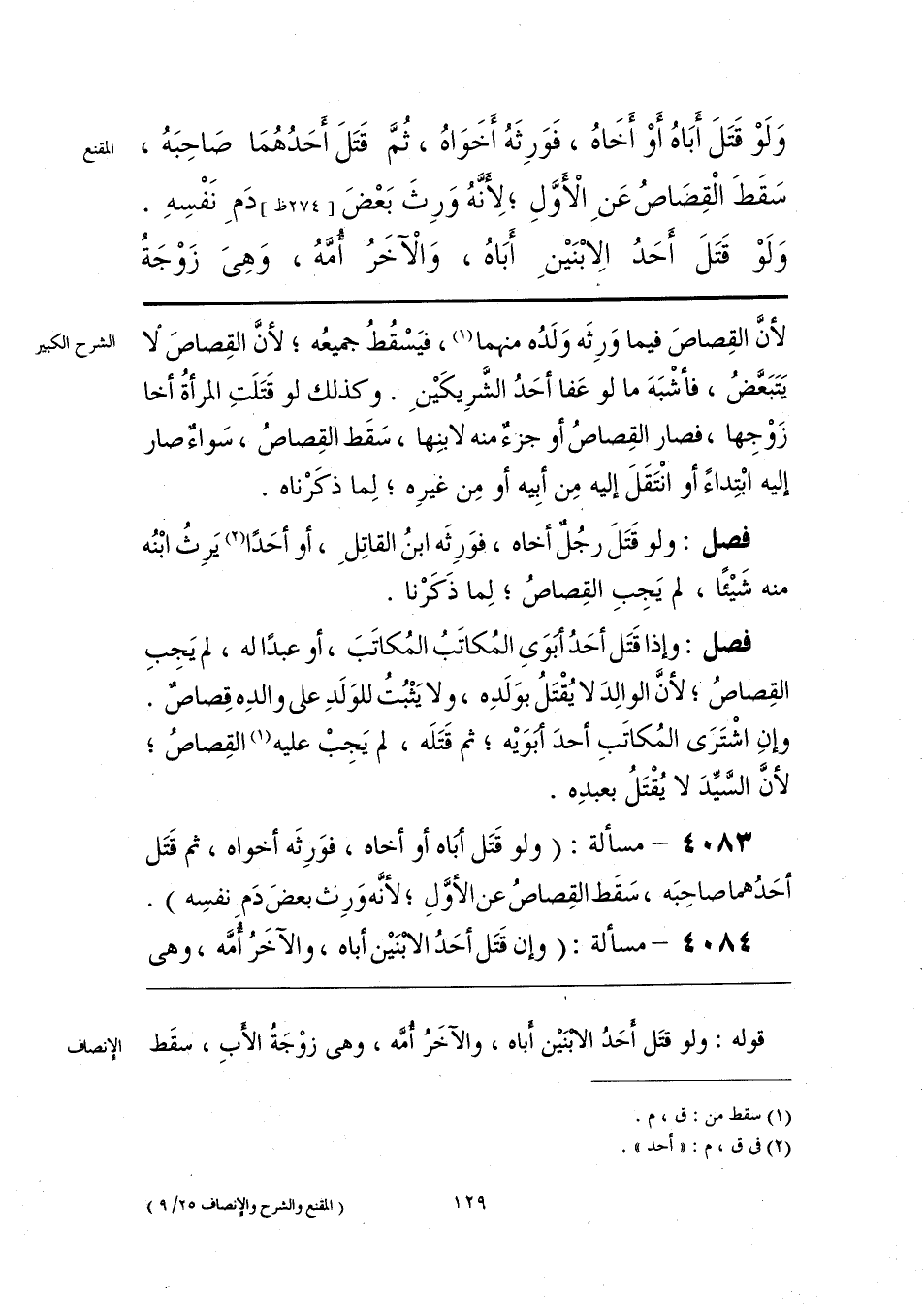 وَلَوْ قَتَلَ أَبَاهُ أَوْ أَخَاهُ، فَوَرِثَهُ أَخَوَاهُ، ثُمَّ قَتَلَ أَحَدُهُمَا صَاحِبَهُ، سَقَطَ الْقِصَاصُ عَنِ الْأَوَّلِ؛ لِأَنَّهُ وَرِثَ بَعْضَ دَمِ نَفْسِهِ. وَلَوْ قَتَلَ أَحَدُ الابْنَيْنَ أَبَاهُ، وَالْآخَرُ أُمَّهُ، وَهِىَ زَوْجَةُ