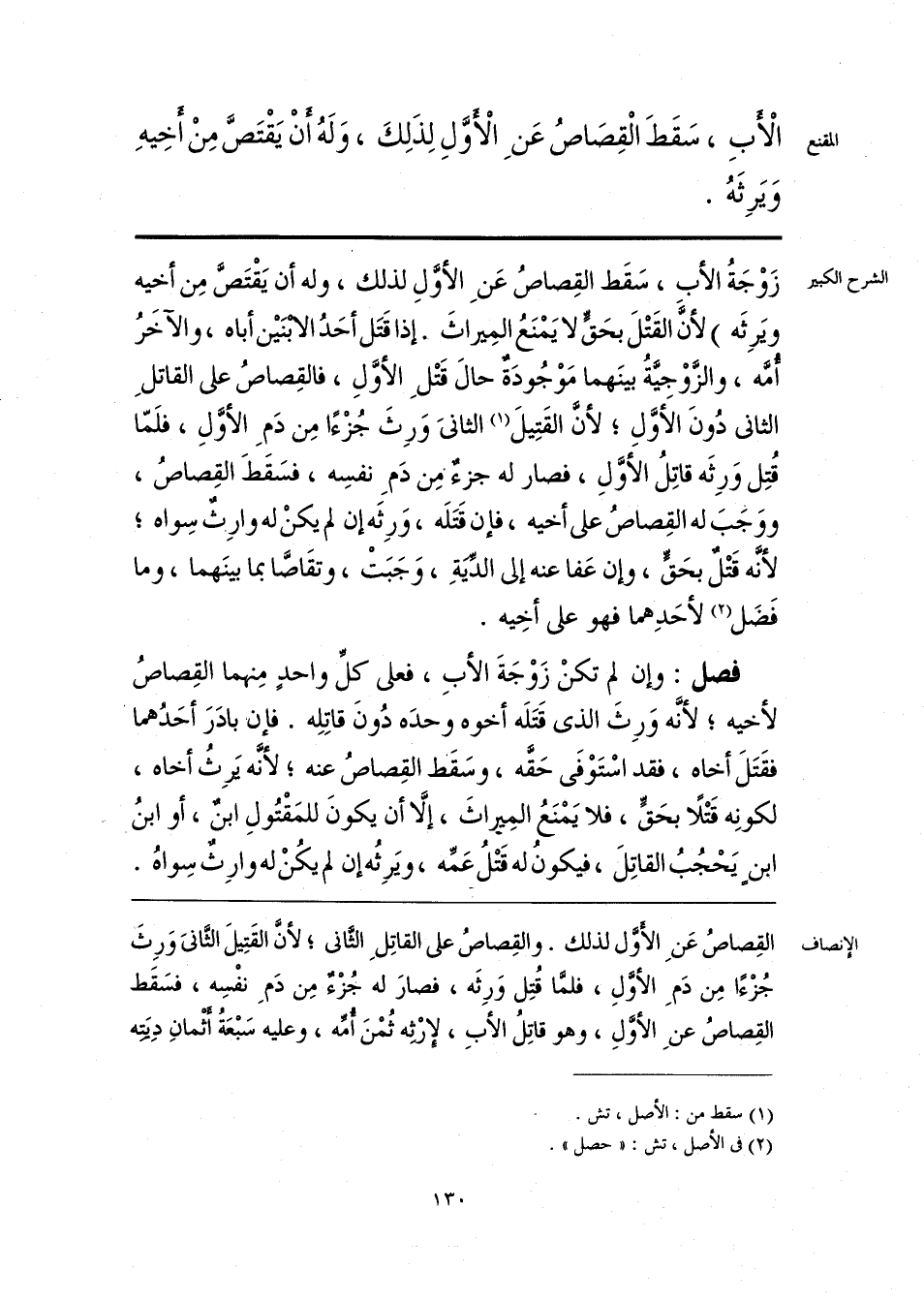 القِصاصُ عَنِ الأَوَّل لذلك. والقِصاصُ على القاتِلِ الثَّانى؛ لأَنَّ القَتِيلَ الثَّانىَ وَرِثَ جُزْءًا مِن دَمِ الأَوَّلِ، فلمَّا قُتِل وَرِثَه، فصارَ له جُزْءٌ مِن دَمِ نفْسِه، فسَقَط القِصاصُ عنِ الأَوَّلِ، وهو قاتِلُ الأبِ، لإِرْثِه ثُمْنَ أُمِّه، وعليه سَبْعَةُ أَثْمانِ دِيَتِه