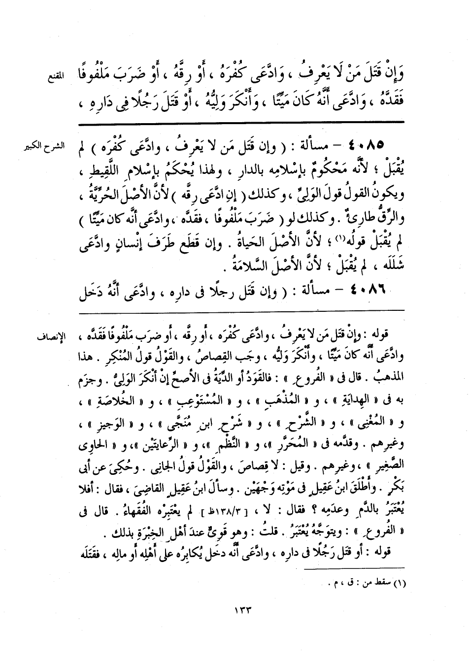 قوله: وإِنْ قتَل مَن لا يَعْرِفُ، وادَّعَى كُفْرَه، أَو رِقَّه، أَو ضرَب مَلْفُوفًا فَقَدَّه، وادَّعَى أَنَّه كانَ مَيِّتًا، وأَنْكَرَ وَليُّه، وجَب القِصاصُ، والقَوْلُ قولُ المُنْكِرِ. هذا المذهبُ. قال فى «الفُروعِ»: فالقَوَدُ أو الدِّيَةُ فى الأصحِّ إنْ أنْكَرَ الوَلِىُّ. وجزَم به فى «الهِدايَةِ»، و «المُذْهَبِ»، و «المُسْتَوْعِبِ»، و «الخُلاصَةِ»، و «المُغْنِى»، و «الشَّرْحِ»، و «شَرْحِ ابنِ مُنَجَّى»، و «الوَجيزِ»، وغيرِهم. وقدَّمه فى «المُحَرَّرِ»، و «النَّظْمِ»، و «الرِّعايتَيْن»، و «الحاوِى الصَّغِيرِ»، وغيرِهم. وقيل: لا قِصاصَ، والقَوْلُ قولُ الجانِى. وحُكِىَ عن أبى بَكْرٍ. وأَطْلَقَ ابنُ عَقِيلٍ فى مَوْتِه وَجْهَيْن. وسألَ ابنُ عَقِيلٍ القاضِىَ، فقال: أفلا يُعْتَبَرُ بالدَّمِ وعدَمِه؟ فقال: لا، لم يعْتَبِرْه الفُقَهاءُ. قال فى «الفُروعِ»: ويتوَجَّهُ يُعْتَبَرُ. قلتُ: وهو قَوِىٌّ عندَ أَهْلِ الخِبْرَةِ بذلك.
