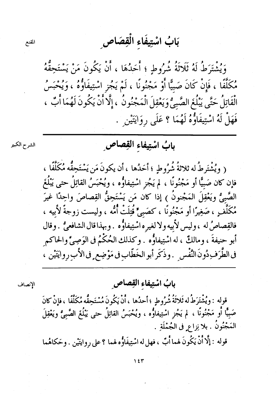 وَيُشْتَرَطُ لَهُ ثَلَاثَةُ شُرُوطٍ؛ أَحَدُهَا، أَنْ يَكُونَ مَنْ يَسْتَحِقُّهُ مُكَلَّفًا، فَإِنْ كَانَ صَبِيًّا أَوْ مَجْنُونًا، لَمْ يَجُزِ اسْتِيفَاؤُهُ، وَيُحْبَسُ الْقَاتِلُ حَتَّى يَبْلُغ الصَّبِىُّ وَيَعْقِلَ الْمَجْنُونُ، إِلَّا أَنْ يَكُونَ لَهُمَا أَبٌ، فَهَلْ لَهُ اسْتِيفَاؤهُ لَهُمَا؟ عَلَى رِوَايَتَيْنِ.
