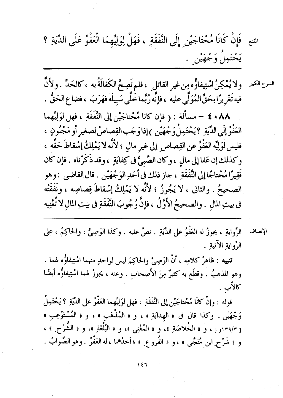 قوله: وإنْ كانَا مُحْتاجَيْن إلى النَّفَقَةِ، فهل لوَلِيِّهما العَفْوُ على الدِّيَةِ؟ يَحْتَمِلُ وَجْهَيْن. وكذا قال فى «الهِدايَةِ»، و «المُذْهَبِ»، و «المُسْتَوْعِبِ»، و «الخُلاصَةِ»، و «المُغْنِى»، و «البُلْغَةِ»، و «الشَّرْحِ»، و «شَرْحِ ابنِ مُنَجَّى»، و «الفُروعِ»؛ أحدُهما، له العَفْوُ. وهو الصَّوابُ.