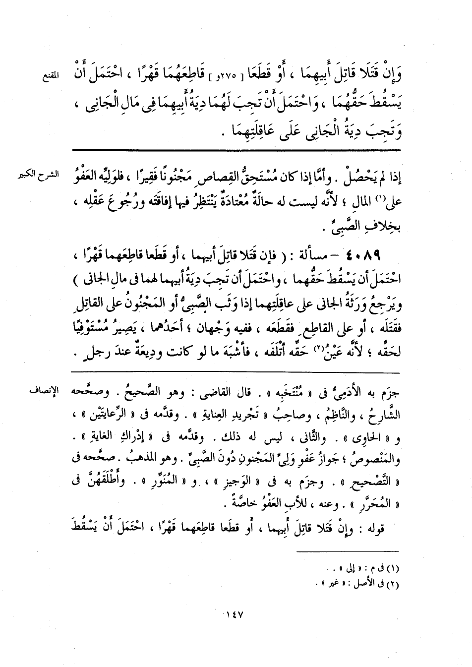 جزَم به الأدَمِىُّ فى «مُنْتَخَبِه». قال القاضى: وهو الصَّحيحُ. وصحَّحه الشَّارِحُ، والنَّاظِمُ، وصاحِبُ «تَجْريدِ العِنايةِ». وقدَّمه فى «الرِّعايتَيْن»، و «الحاوِى». والثَّانى، ليس له ذلك. وقدَّمه فى «إِدْراكِ الغايةِ». والمَنْصوصُ؛ جَوازُ عَفْوِ وَلِىِّ المَجْنونِ دُونَ الصَّبِىِّ. وهو المذهبُ. صحَّحه فى «التَّصْحيحِ». وجزَم به فى «الوَجيزِ»، و «المُنَوِّرِ». وأطْلَقَهُنَّ فى «المُحَرَّرِ». وعنه، للأب العَفْوُ خاصَّةً.