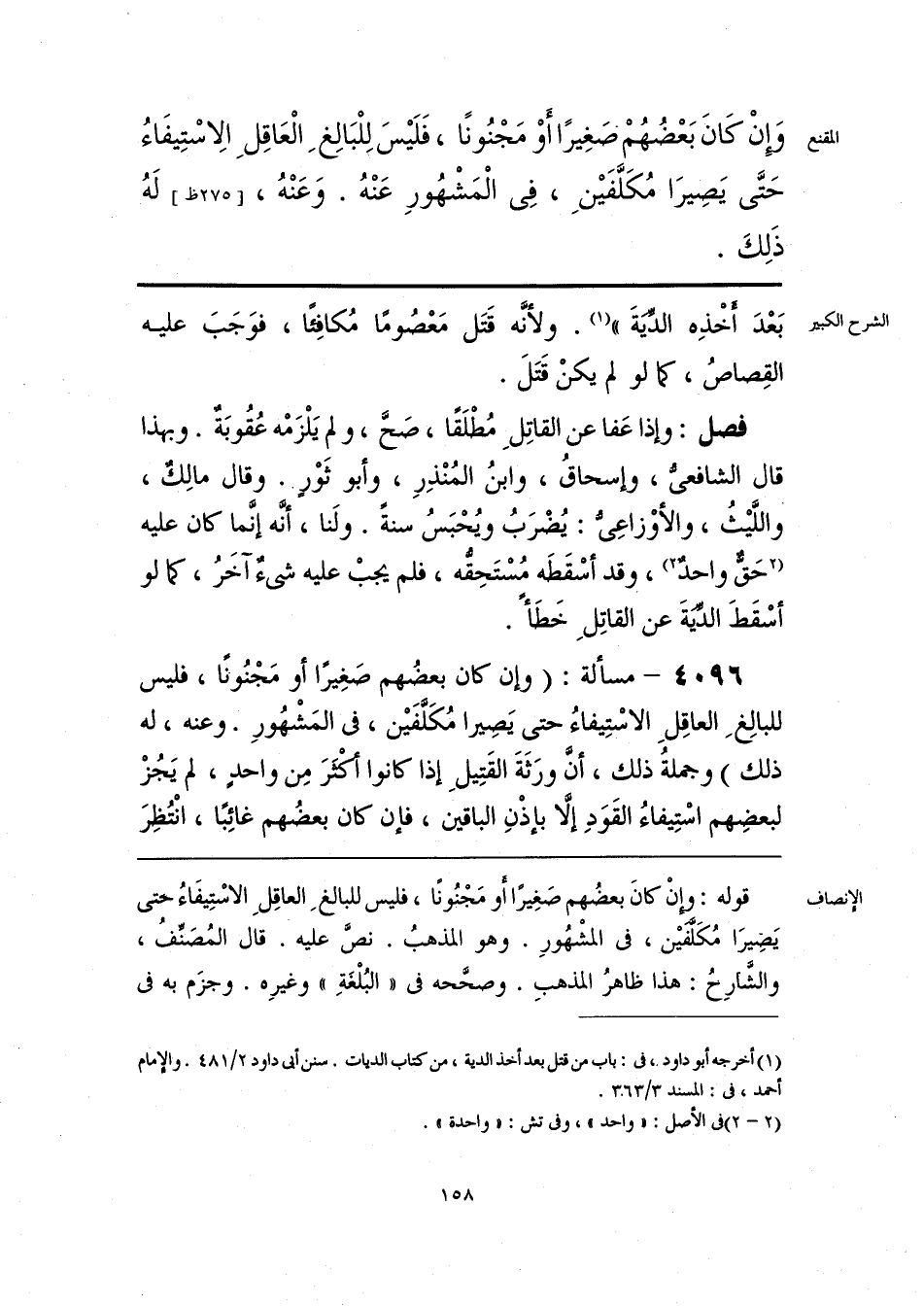 وَإِنْ كَانَ بَعْضُهُمْ صَغِيرًا أَوْ مَجْنُونًا، فَلَيْسَ لِلْبَالِغِ الْعَاقِلِ الِاسْتِيفَاءُ حَتَّى يَصِيرَا مُكَلَّفَيْنِ، فِى الْمَشهُورِ عَنْهُ. وَعَنْهُ، لَهُ ذَلِكَ.