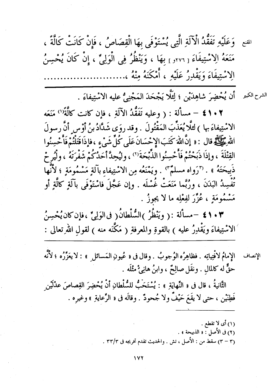 الثَّانيةُ، قال فى «النِّهايَةِ»: يُسْتَحَبُّ للسُّلْطانِ أن يُحْضِرَ القِصاصَ عدْلَيْن فَطِنيْن، حتَّى لا يقَعَ حَيْف ولا جُحودٌ. وقالَه فى «الرِّعايَةِ» وغيرِه.