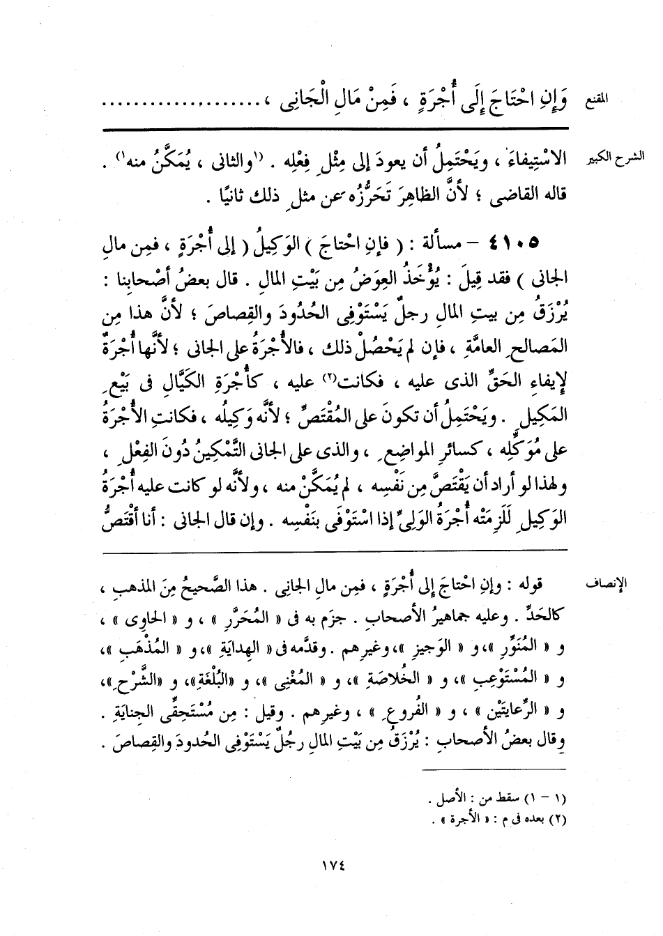 قوله: وإنِ احْتاجَ إلى أُجْرَةٍ، فمِن مالِ الجانِى. هذا الصَّحيحُ مِنَ المذهبِ، كالحَدِّ. وعليه جماهيرُ الأصحابِ. جزَم به فى «المُحَرَّرِ»، و «الحاوِى»، و «المُنَوِّرِ»، و «الوَجيزِ»، وغيرِهم. وقدَّمه فى «الهِدايَةِ»، و «المُذْهَبِ»، و «المُسْتَوْعِبِ»، و «الخُلاصَةِ»، و «المُغْنِى»، و «البُلْغَةِ»، و «الشَّرْحِ»، و «الرِّعايتَيْن»، و «الفُروعِ»، وغيرِهم. وقيل: مِن مُسْتَحِقِّى الجِنايَةِ. وقال بعضُ الأصحابِ: يُرْزَقُ مِن بَيْتِ المالِ رجُلٌ يَسْتوْفِى الحُدودَ والقِصاصَ.