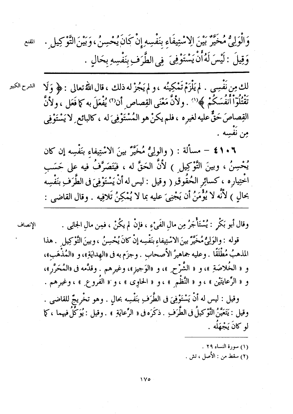 قوله: والوَلِىُّ مُخَيَّرٌ بينَ الاسْتِيفاءِ بنَفْسِه إنْ كانَ يُحْسِنُ، وبينَ التَّوْكِيلِ. هذا المذهبُ مُطْلَقًا. وعليه, جماهيرُ الأصحابِ. وجزَم به فى «الهِدايَةِ»، و «المُذْهَبِ»، و «الخُلاصَةِ»، و «الشَّرحِ»، و «الوَجيزِ»، وغيرِهم. وقدَّمه فى «المُحَرَّرِ»، و «الرِّعايتَيْن»، و «النَّظْمِ»، و «الحاوِى»، و «الفُروعِ»، وغيرِهم.