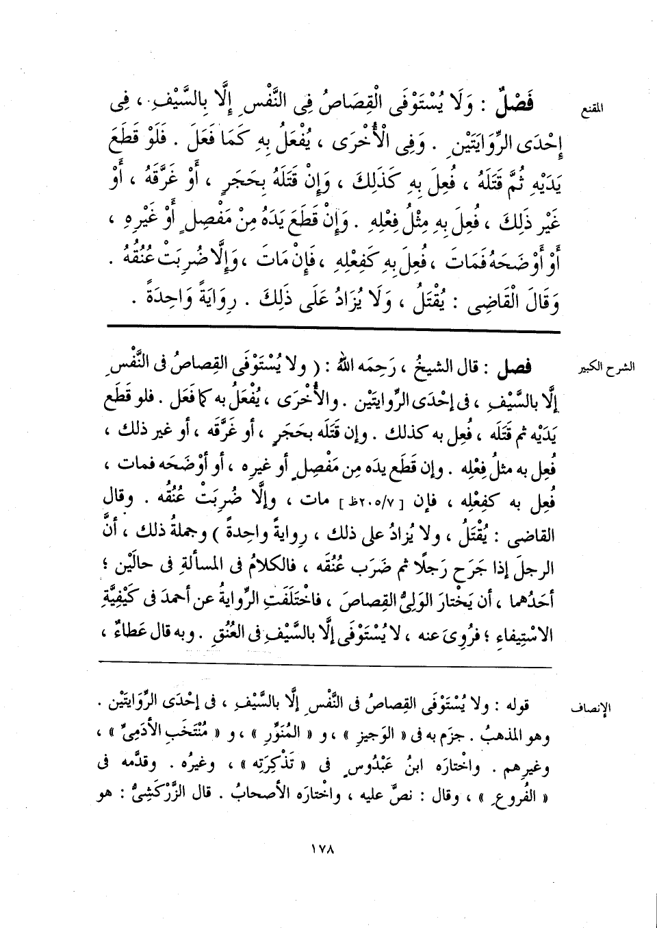 فَصْلٌ: وَلَا يُسْتَوْفَى الْقِصَاصُ فِى النَّفْسِ إِلَّا بِالسَّيْفِ، فِى إِحْدَى الرِّوَايَتَيْنِ. وَفِى الأُخْرَى، يُفْعَلُ بِهِ كَمَا فَعَلَ. فَلَوْ قَطَعَ يَدَيْهِ ثُمَّ قَتَلَهُ، فُعِلَ بِهِ كَذَلِكَ، وَإِنْ قَتَلَهُ بِحَجَرِ، أَوْ غَرَّقَهُ، أَوْ غَيْر ذَلِكَ، فُعِلَ بِهِ مِثْلُ فِعْلِهِ. وَإِنْ قَطَعَ يَدَهُ مِنْ مَفْصِلٍ أَوْ غَيْرِهِ، أَوْ أَوْضَحَهُ فَمَاتَ، فُعِلَ بِهِ كَفِعْلِهِ، فَإِنْ مَاتَ، وَإلَّا ضُرِبت عُنُقُهُ. وَقَالَ الْقَاضِى: يُقْتَلُ، وَلَا يُزَادُ عَلَى ذَلِكَ. رِوَايَةً وَاحِدَةً.