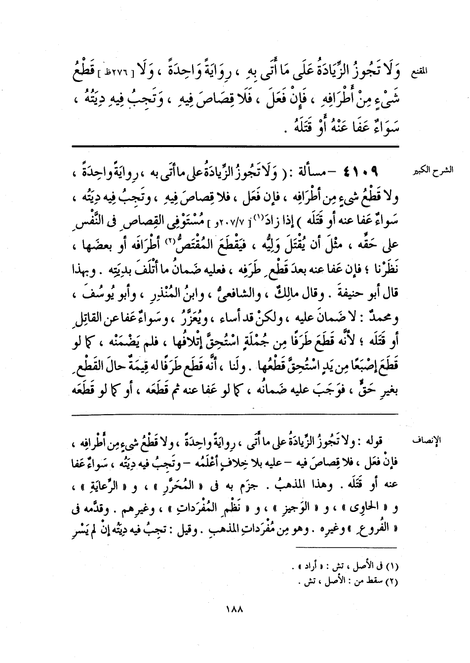 قوله: ولا تَجُوزُ الزِّيادَةُ على ما أَتَى، رِوايَةً واحِدَةً، ولا قَطْعُ شئٍ مِن أَطْرافِه، فإنْ فعَل، فلا قِصاصَ فيه -عليه بلا خِلافٍ أعْلَمُه- وتَجِبُ فيه دِيَتُه، سَواءٌ عَفا عنه أو قَتَلَه. وهذا المذهبُ. جزَم به فى «المُحَرَّرِ»، و «الرِّعايَةِ»، و «الحاوِى»، و «الوَجيزِ»، و «نَظْمِ المُفْرَداتِ»، وغيرِهم. وقدَّمه فى «الفُروعِ» وغيرِه. وهو مِن مُفْرَداتِ المذهبِ. وقيل: تجِبُ فيه دِيَتُه إنْ لم يَسْرِ