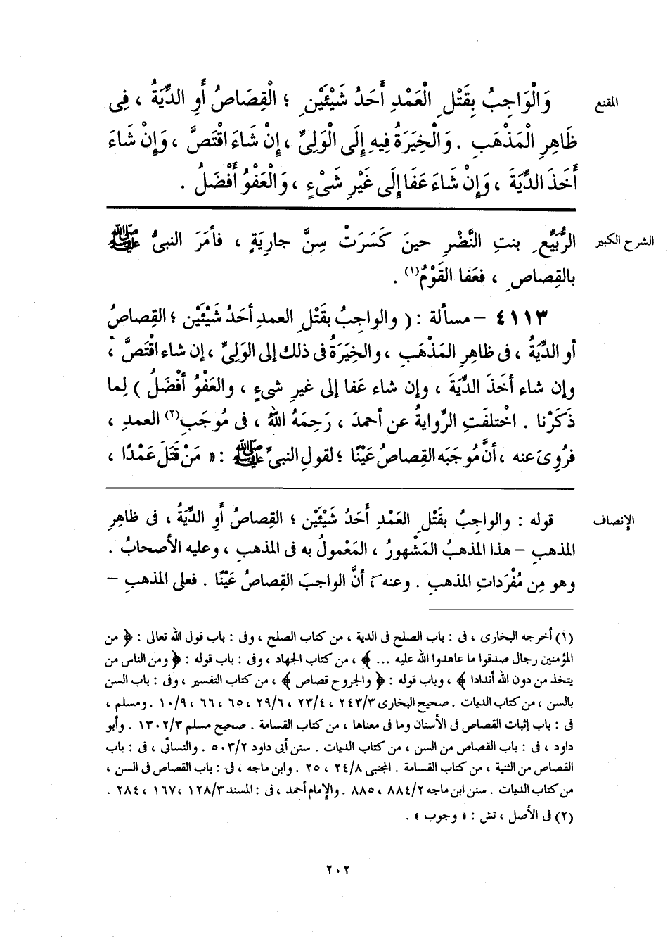 وَالْوَاجِبُ بِقَتْلِ الْعَمْدِ أحَدُ شَيْئَيْنِ؛ الْقِصَاصُ أوِ الدِّيَةُ، فِى ظَاهِرِ الْمَذْهَبِ. وَالْخِيَرَةُ فِيهِ إِلَى الْوَلِىِّ، إِنْ شَاءَ اقْتَصَّ، وَإِنْ شَاءَ أخَذَ الدِّيَةَ، وَإِنْ شَاءَ عَفَا إِلَى غَيْرِ شَىْءٍ، وَالْعَفْوُ أَفْضَلُ.